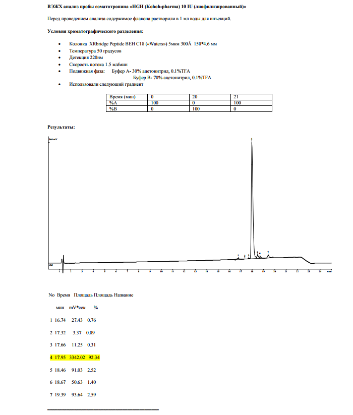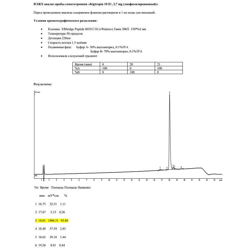 Так как с гормоном роста осталось много белых пятен решил немного прояснить ситуацию,до сих пор кто то ориентируется на показатели именно по СТГ,кто то но их мало на ИФР,я же придерживаюсь понятия о совокупности этих двух показателей,так как может быть высокий СТГ и при этом низкий ИФР и наоборот. Особенности организмов и печени я во внимание брать не буду,так как у каждого они свои,поэтому буду отталкиваться именно от своих результатов и данных хромоанализов. Основная проблема заключается конечно в чистоте продукта и вот здесь все любят приписывать себе циферки поболее,хотя всем известно что хороший гормон стоить дёшево не может,мне за всё время пользования китайского производства не попадался больше чем 95% чистоты очистки,а так в основном цифры колеблются от 91 до 94%. И так поехали первым шёл хайгетропин на протяжении 20 дней по 5ед каждый день: