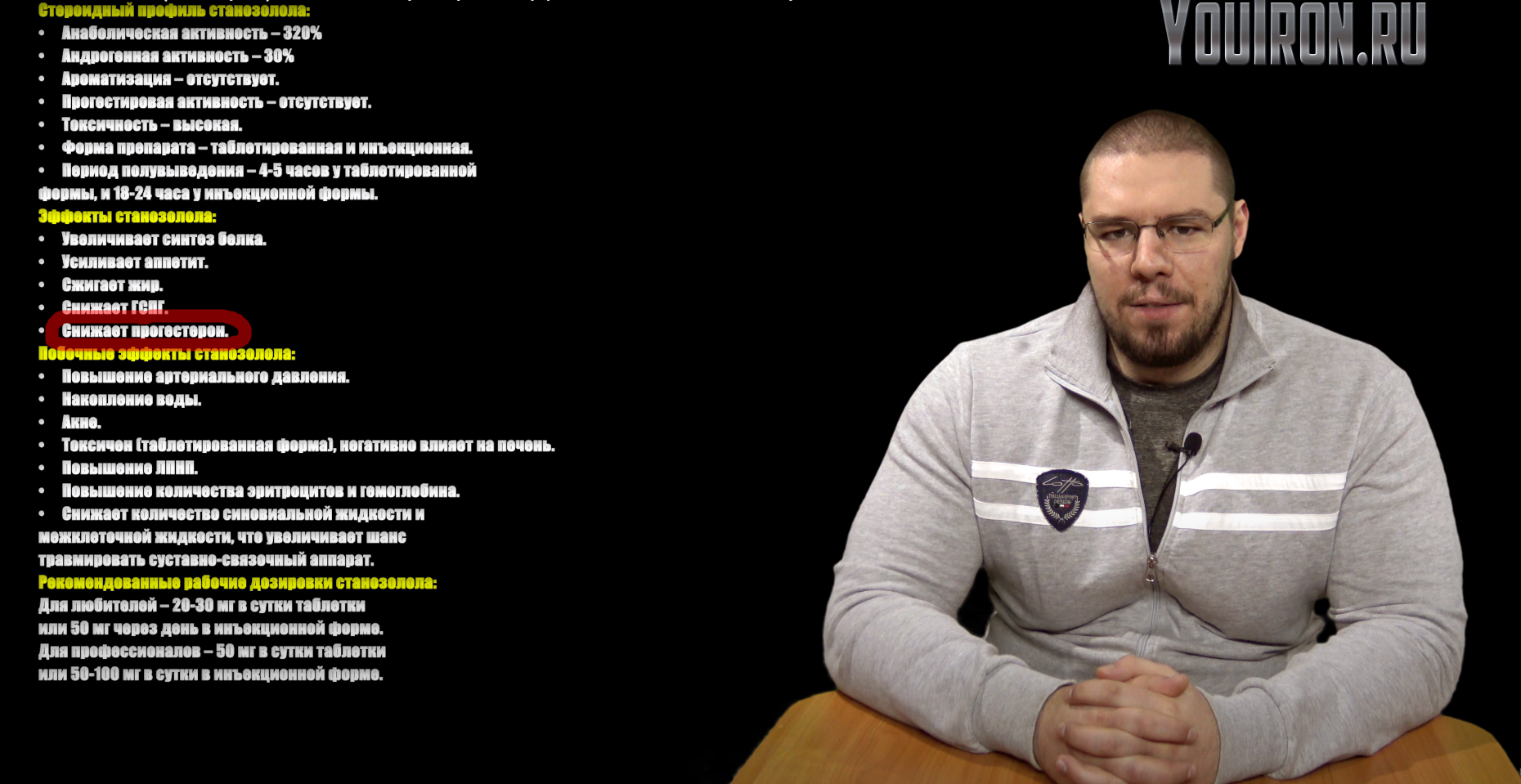 Очень часто мне приходилось слышать от авторитетных людей, что прием станозолола совместно с прогестинами помогает понизить уровень прогестерона на курсе и сделать прием таких стероидов более безопасным. Трудно сказать, правда ли это. Но этой же точки зрения придерживаются многие профессионалы, др. Любер в том числе. Поэтому у меня есть все основания для того, чтоб в своей статье свести это мнение к «фармакологической аксиоме» и рекомендовать на курсах с применением прогестинов добавлять в свой химарсенал 30-40мг станазы в день… для профилактики.