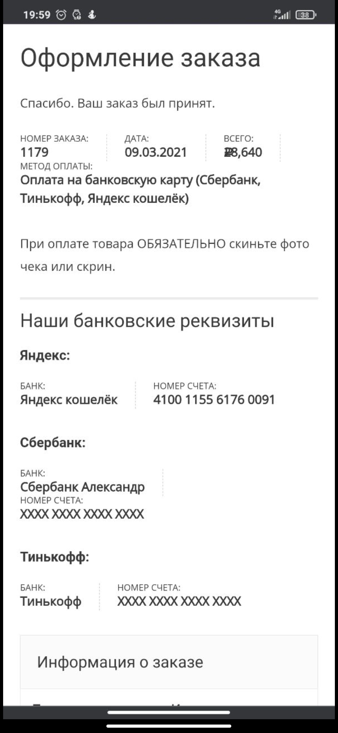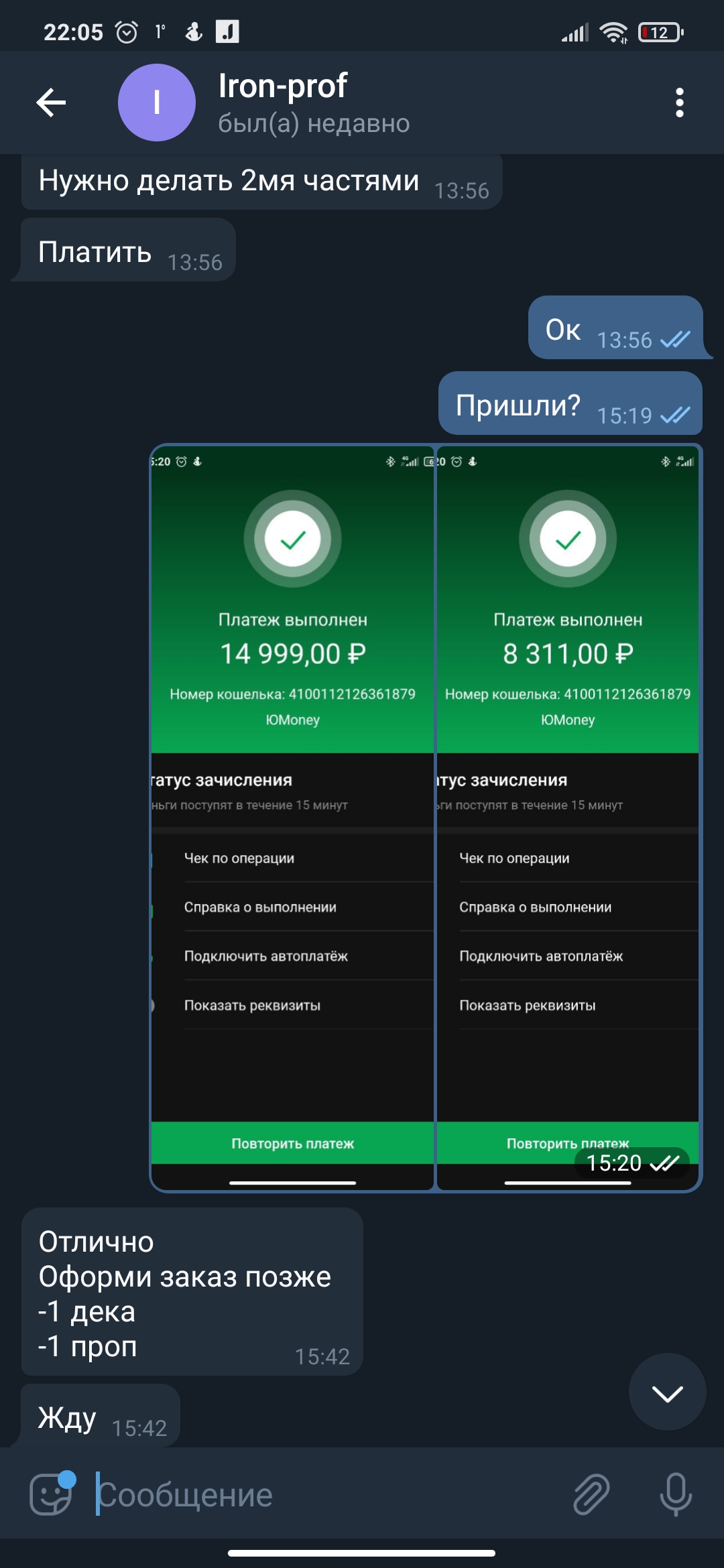 4. Сделал заказ #1179, на сайте Iron-prof.com 09.03.2021г. Заказ оплатил, получение денег дил подтвердил (в телеграме Iron-prof) Продавец сказал что отправит трек код через 10, если забудет, то нужно будет напомнить. Я напомнил 20.03.2021г. Продавец сказал что после выходных начнёт отсылать треки. В пн 22.03.2021г. Трек не получил, продавец перестал выходить на связь. Заглянул на форум, оказалось таких ситуаций много.