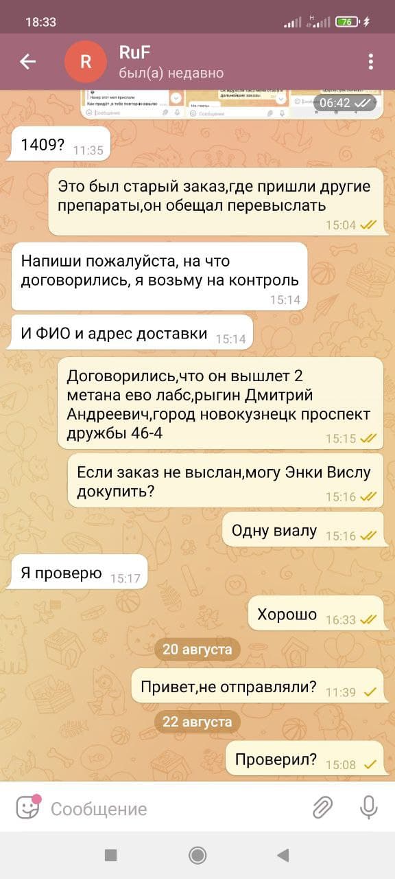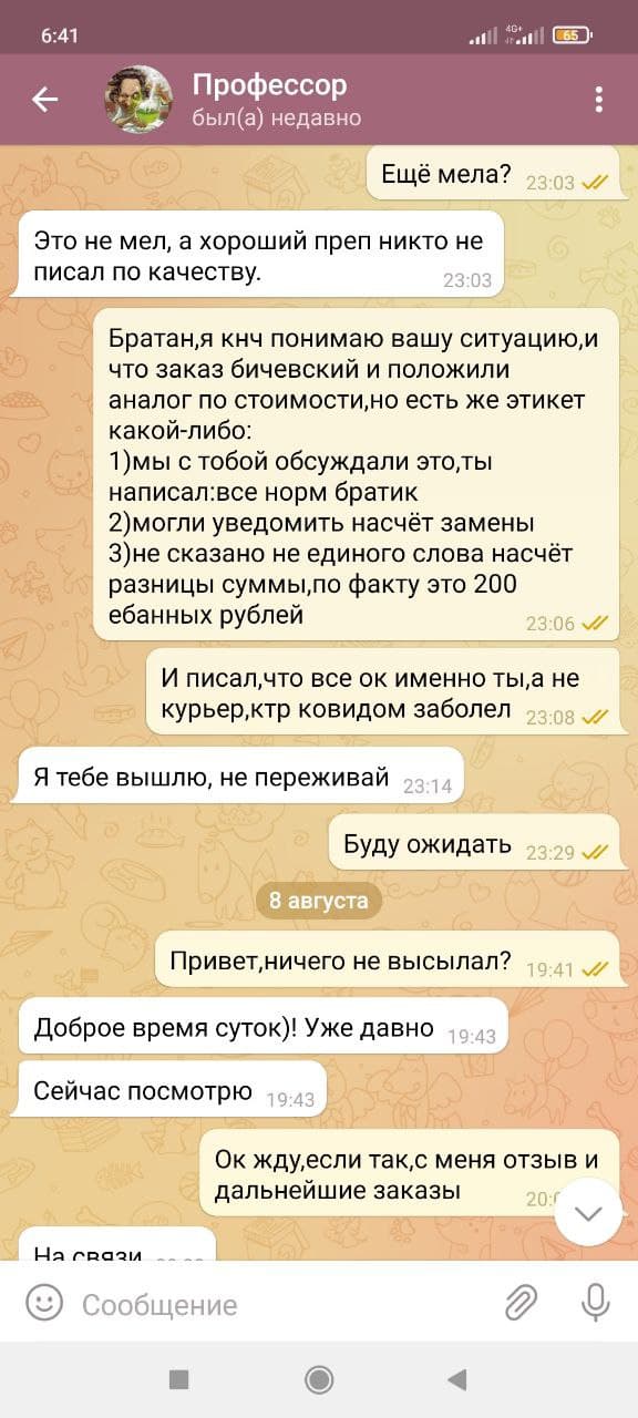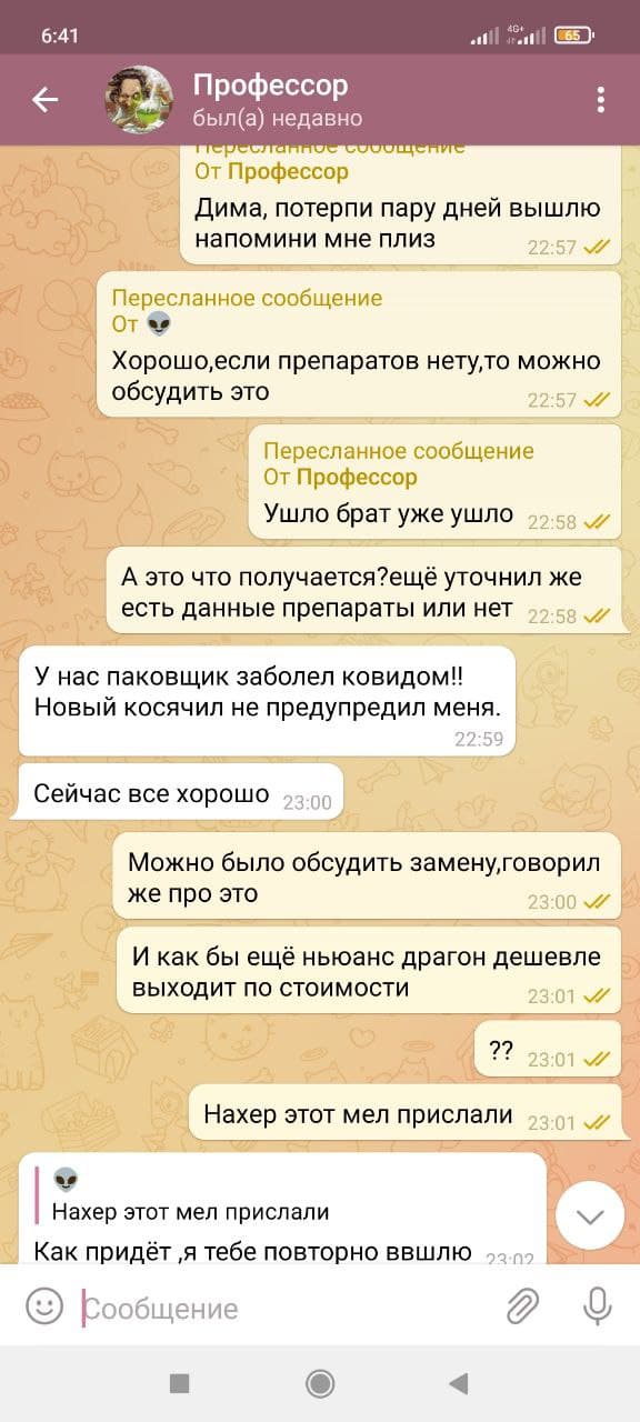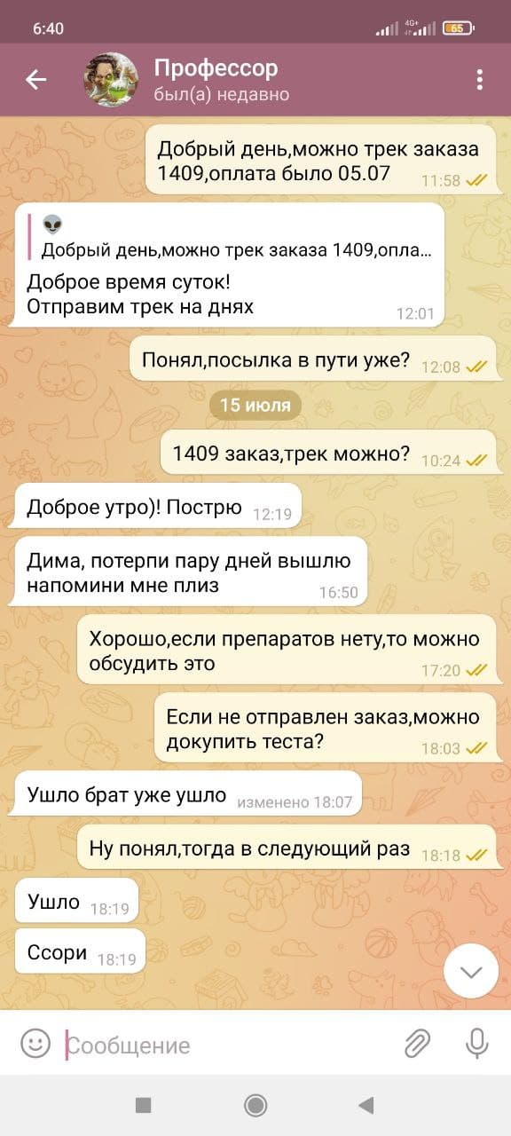 3 Сделал заказ на сайте Стероиды для профессионалов и начинающих 05.07.2021,оплату произвел в этот же день.Получил посылку на почте,снял распаковку на видео,где оказался товар другой фирмы,при отправке была задержка,где я спрашивал у професора в личных сообщениях;если данного товара нету,то могу доплатить,чтобы выслали другой,на что он ответил;все окей братик.По факту прислали какую-то муку,после личной переписки администрация сказала,что перешлет заказ,но не трека,не дальнейшего общения не было,дальше только кормили завтраками,а после игнор со стороны 2 админов.