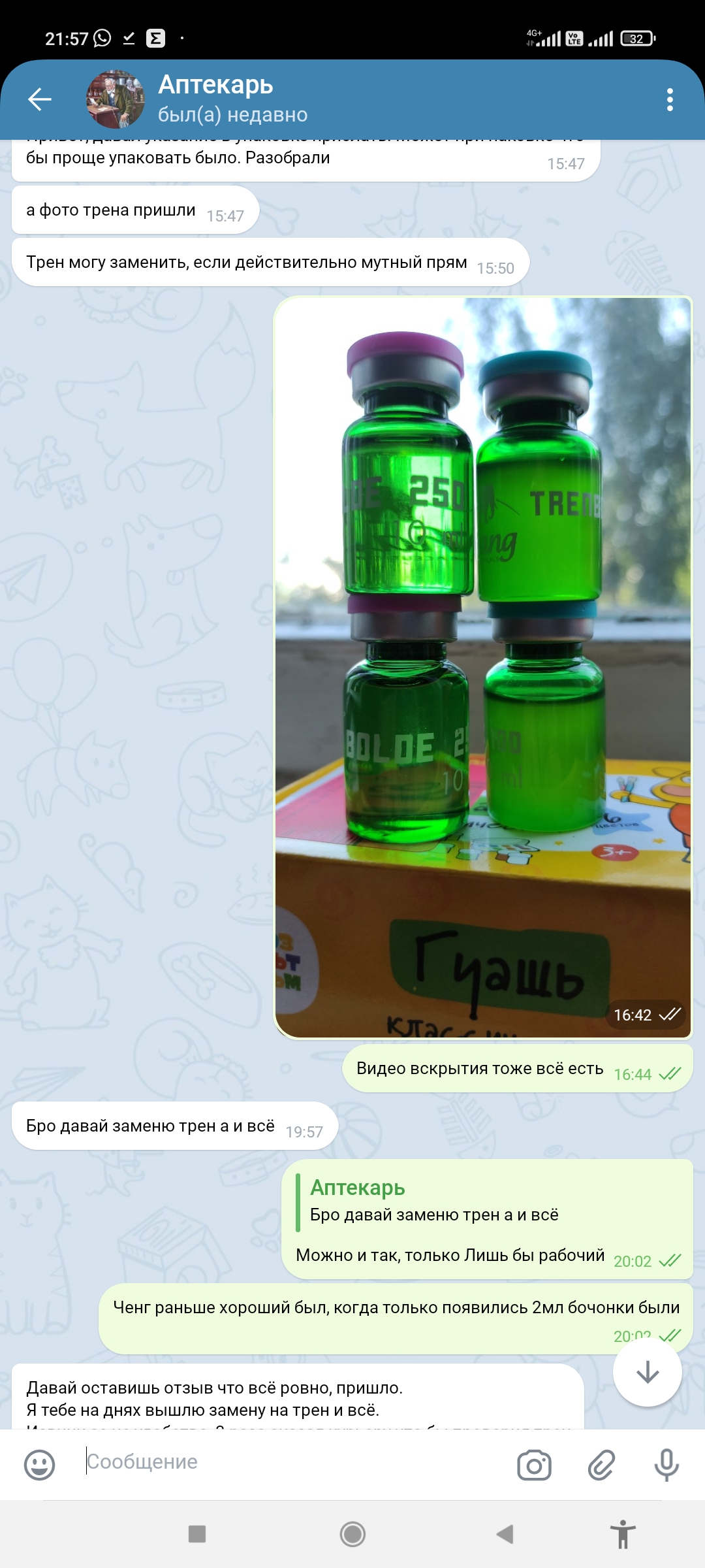 Всё четко и быстро тебе доставили, по трену с тобой обговорил, да вышел "косяк". Как оказалось что партия трена от чанг пришла мутновата на склад, упустил момент, каюсь, как я выяснил в последних поставках он у всех мутноват, ты вроде говорил сам что где то заказывал и тоже мутноватый пришел)