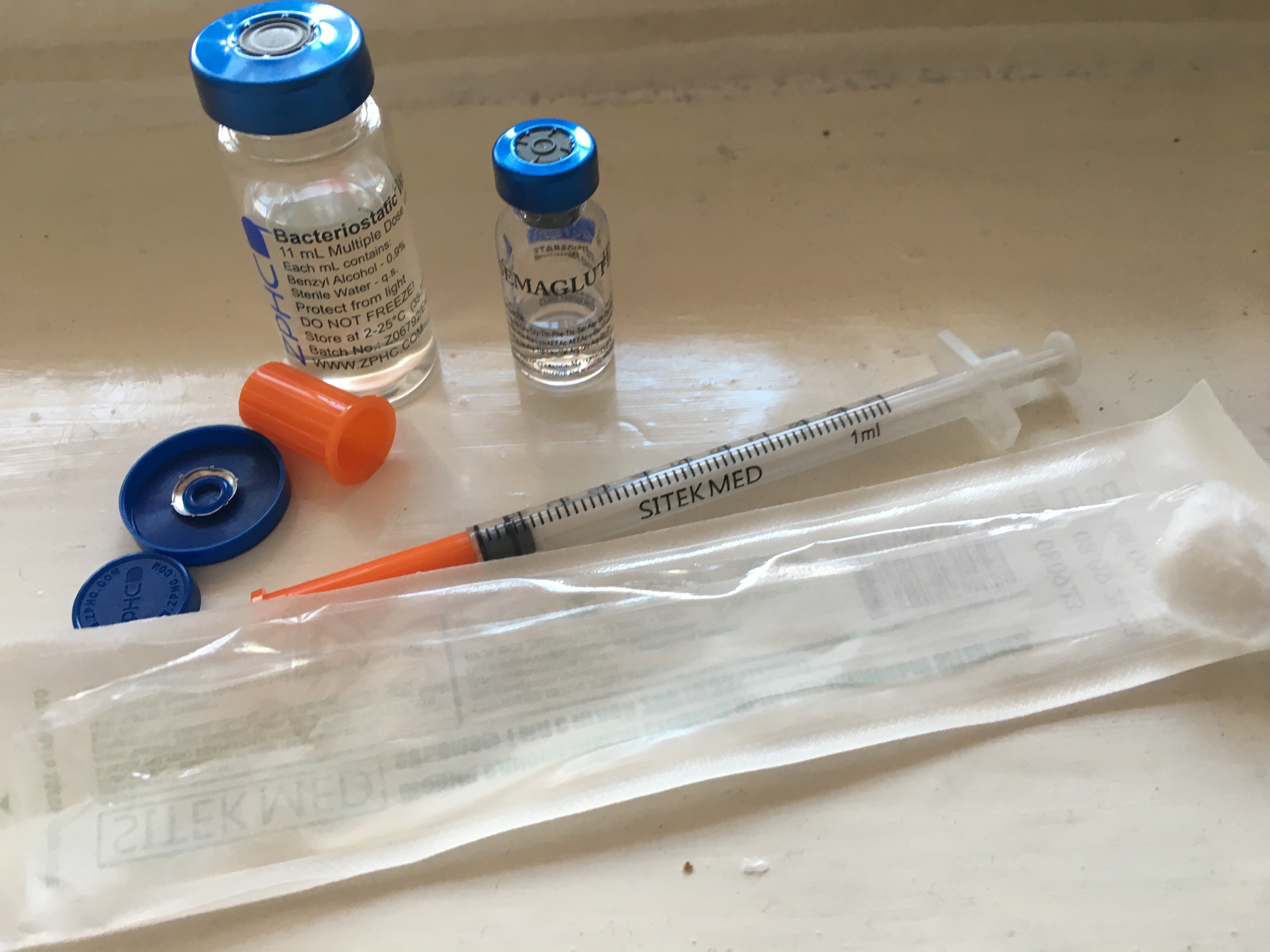 Утром сделал укол, дозировка 0.25 мг. Порошок растворяется не сразу, 1 мл бак воды использовал, приходится крутить виалу в руке. Вакуум есть внутри виалы. Лучше использовать несколько шприцев, после всех этих манипуляций с проколами, кожу на животе не получалось пробить этой иглой, несколько минут пытался это сделать и вышло, но из-за этого осталось покраснение на коже. Но сам семаглютид вводится безболезненно.