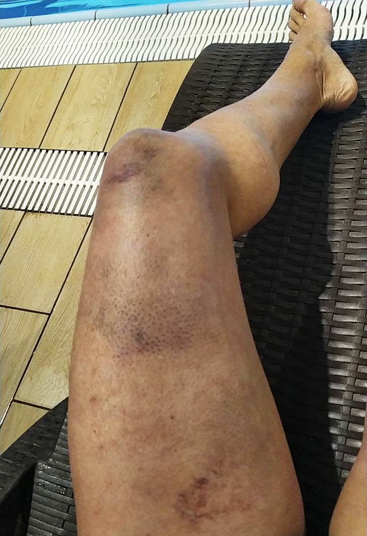 3 недели назад, когда делала 240 кг х 6 раз и 4 подхода, травмировала ногу. 4й подход был явно лишним. Сначала было всё нормально, а через 3 часа судорогой свело квадру. Сначала просто посмеялась на эту тему, но вечером начали выходить синяки по всей ноге и стало понятно - это не просто свело ногу, а произошёл разрыв мышц.