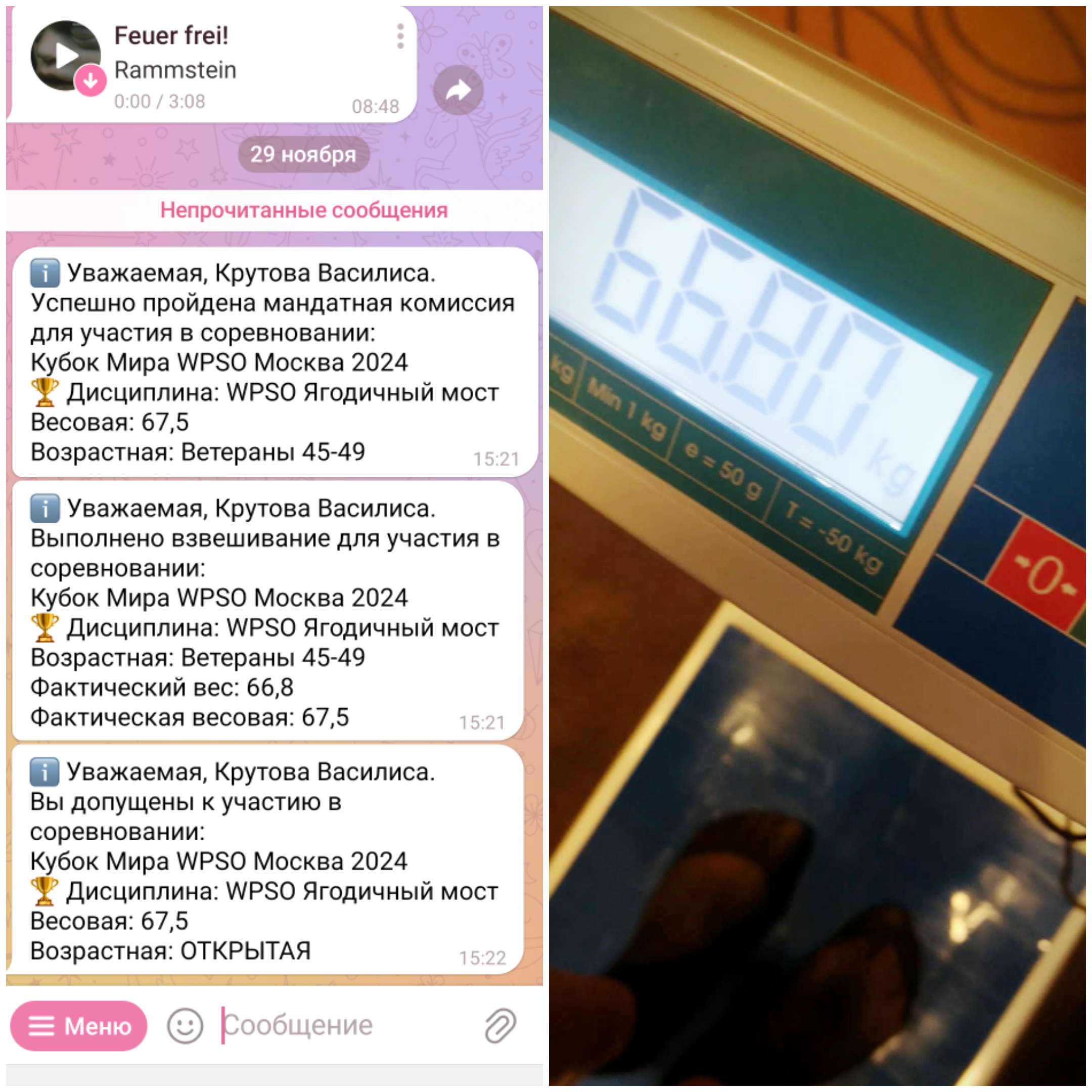 Со мной в весовой до 67,5 кг оказалась девушка, которая изначально была в 75 весовой категории. Первоначальный вес был 245 кг у меня и 250 кг у неё