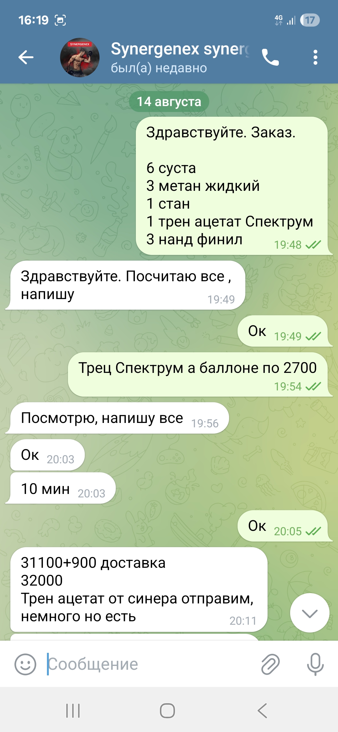 25.08 я получил ее от курьера Яндекса. При распаковке (видео есть) из всего того что я заказал не хватало 1 фл тренболона Ацетата. Администратор сразу сказал ну его не было и ты же не один заказывал и всем не хватило , потом пришлём когда нибудь. При этом я изначально заказывал Спектрум трен но он сам же сказал что нашелся и синергеникс , но по итогу вообще не какого не положили .