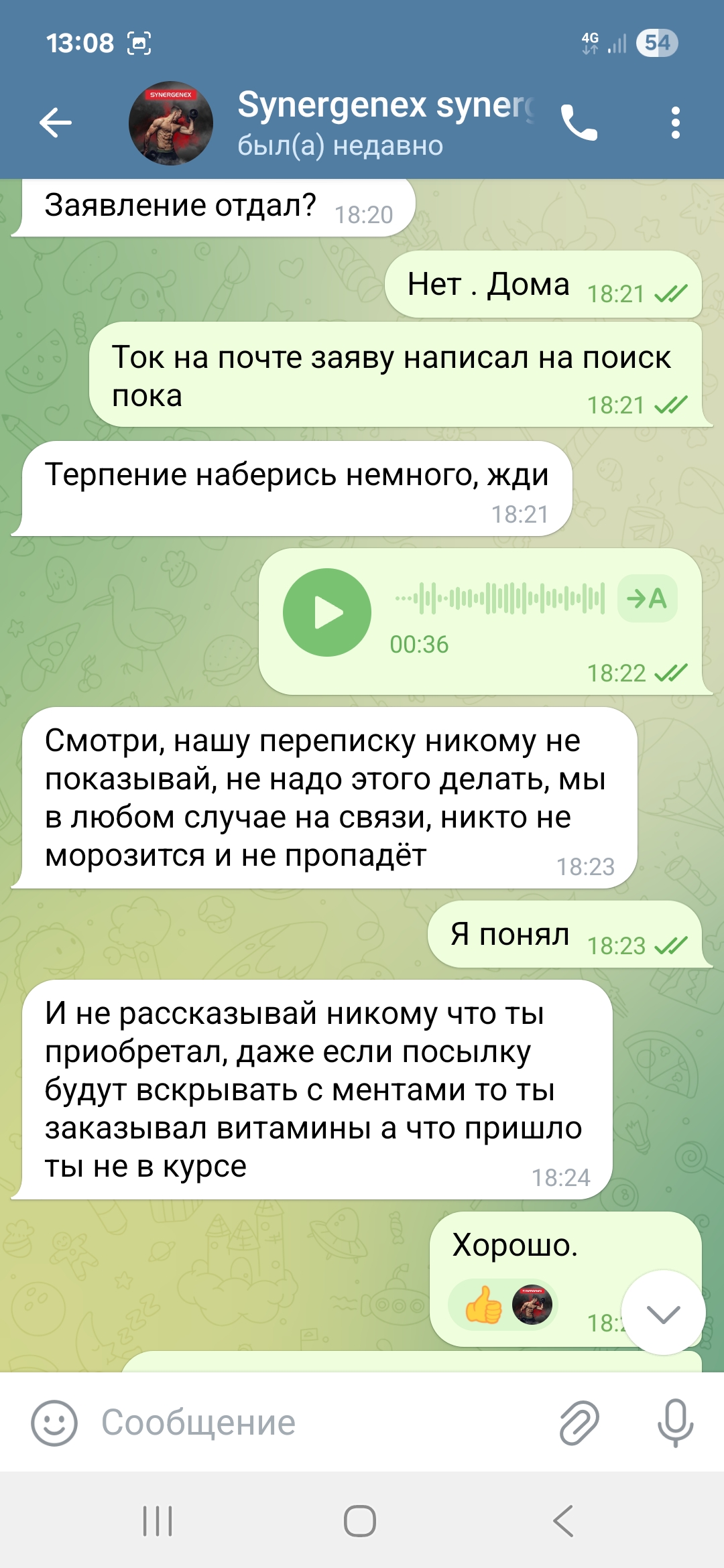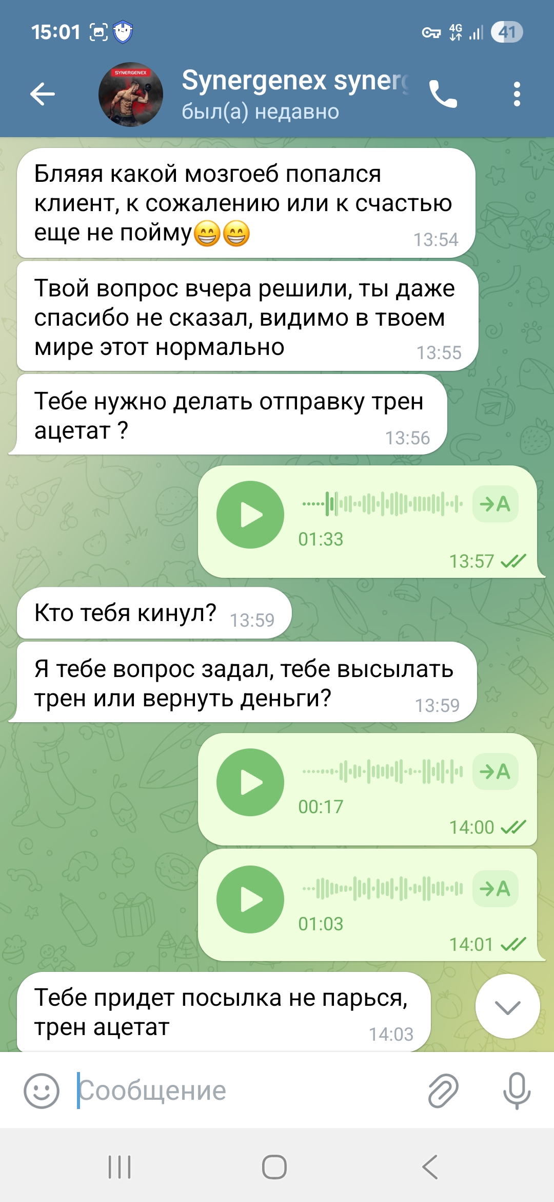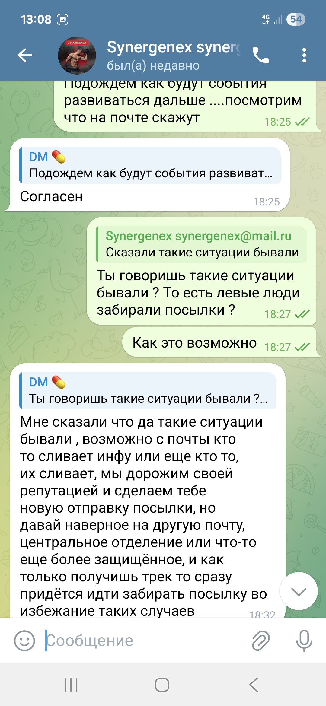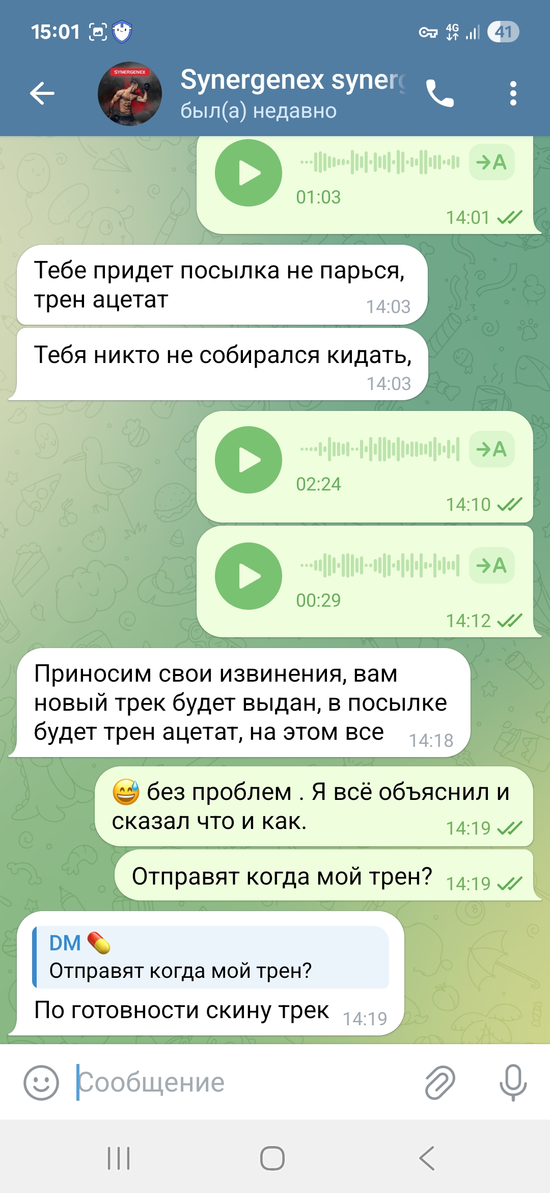 На что он ответил , какая то ерунда я не кому твой трек не давал и если забрали то возможно менты и если начнёшь дальше писать заявление и т д то вообще привлекут по закону за покупку стеройдов))) Смешно конечно , так как карается только продажа а не покупка. В общем то сначала была фаза запугивания , она не прошла и тогда поняв что я это так не оставлю и что дело может пахнуть полицией , сказал подожди сейчас все решим. Потом началась новая песня , что это работники почты слили трек и кто то из них пришел и забрал посылку ))) ( да, это же айфон дорогой или часы золотые, макбук и т д которые проще украсть на пересылке) но пообещал все вернуть.