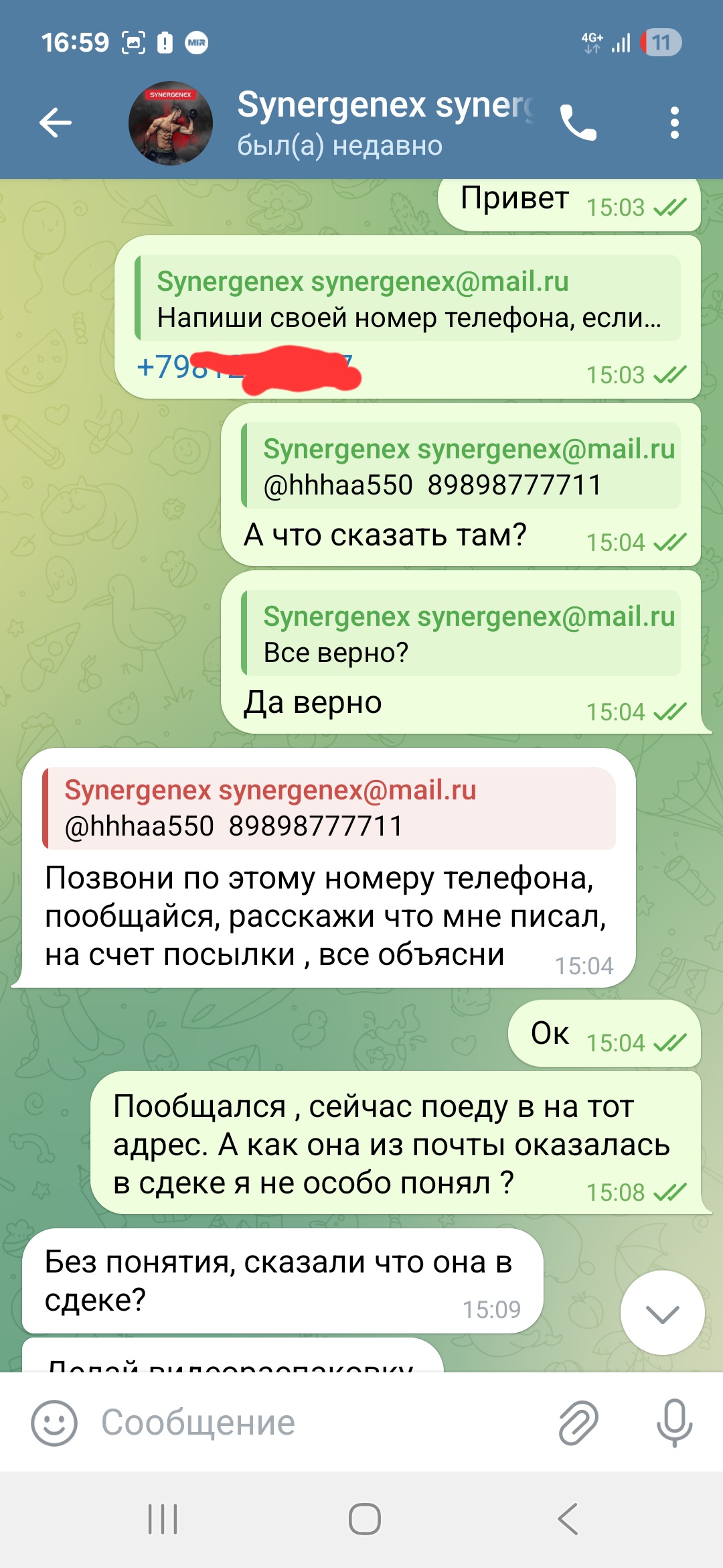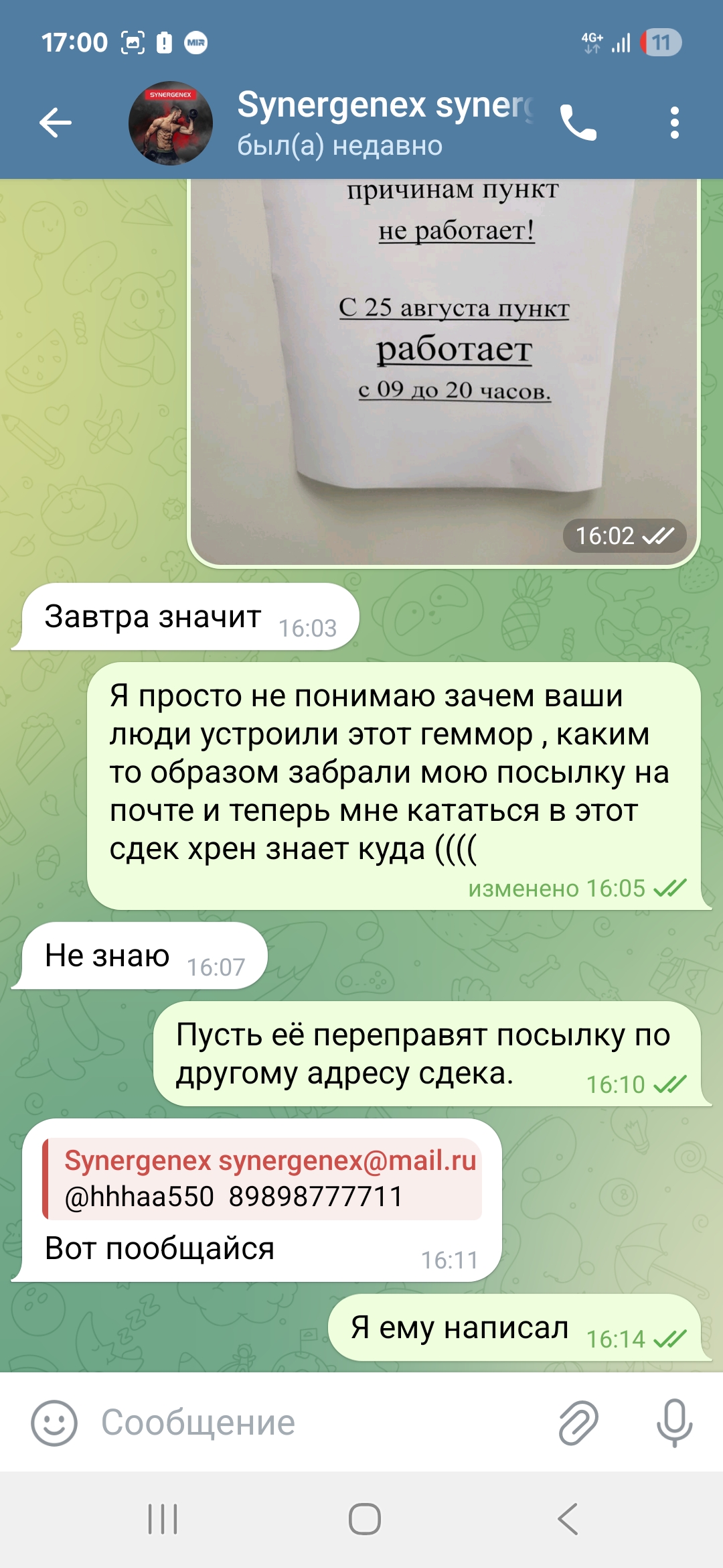 На след день 24.08 уже запели новую "песню" , администор прислал данные человека и тел @hhhaa550, сказал звонить ему и он всё скажет по посылке. Данный индивид невнятно сознался что забрал посылку с почты и теперь она в сдеке , на вопрос зачем внятного ответа не было , сказал написать администратору у которого делал заказ, что я и сделал. Но тот ответил что не знает как такое произошло (гениально!)......@hhhaa550 сказал я могу ее забрать если приеду по адресу г.Рязань Грибоедова 46 (пункт Сдека) но сказал набрать ему по приезду . Сдек оказался закрыт по техническим причинам. Тогда сказал завтра заехать туда опять.