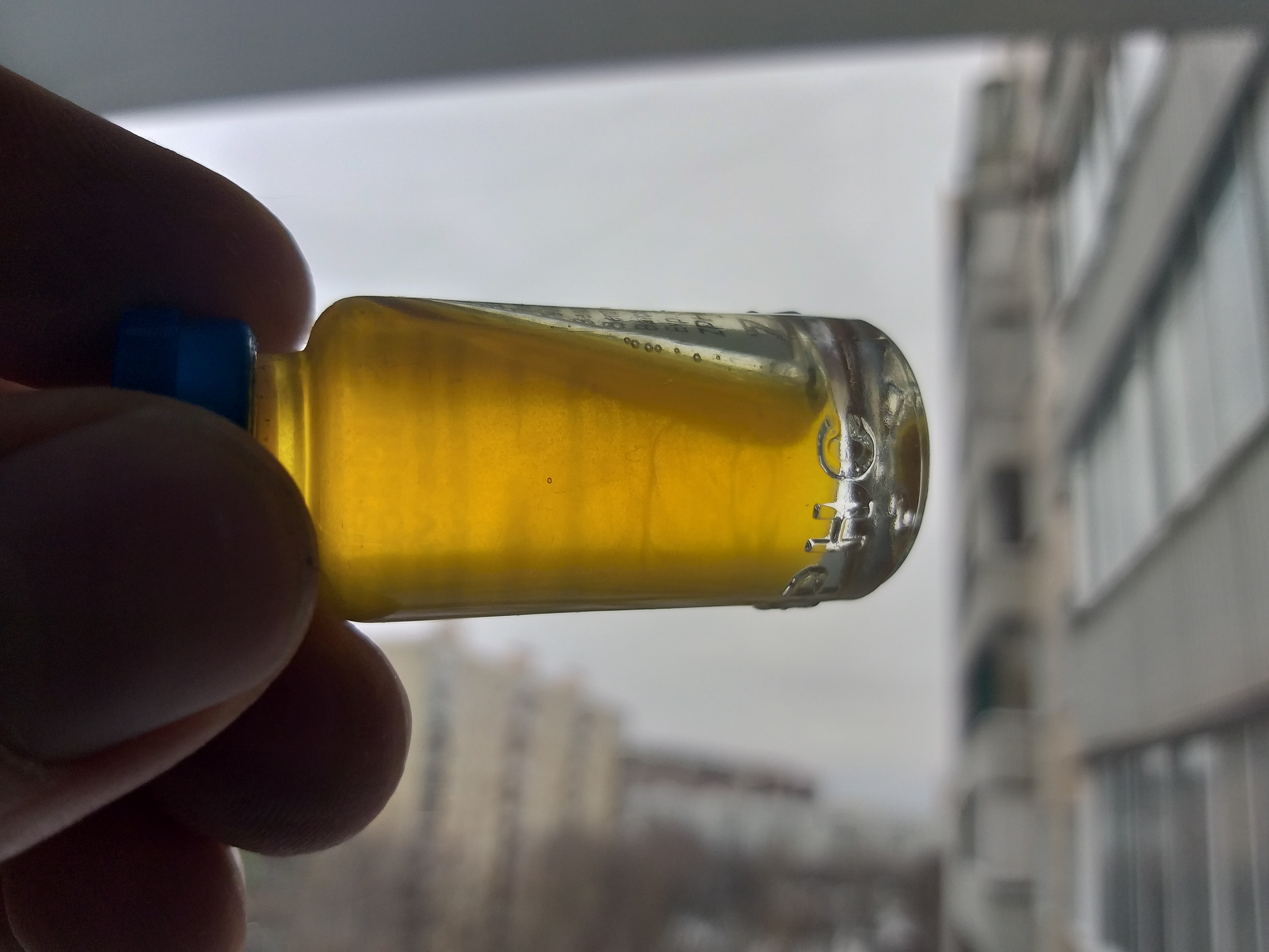Положи виалу на бок и сфотографируй, но лучше конечно на свет подними или на лампу дневного света.