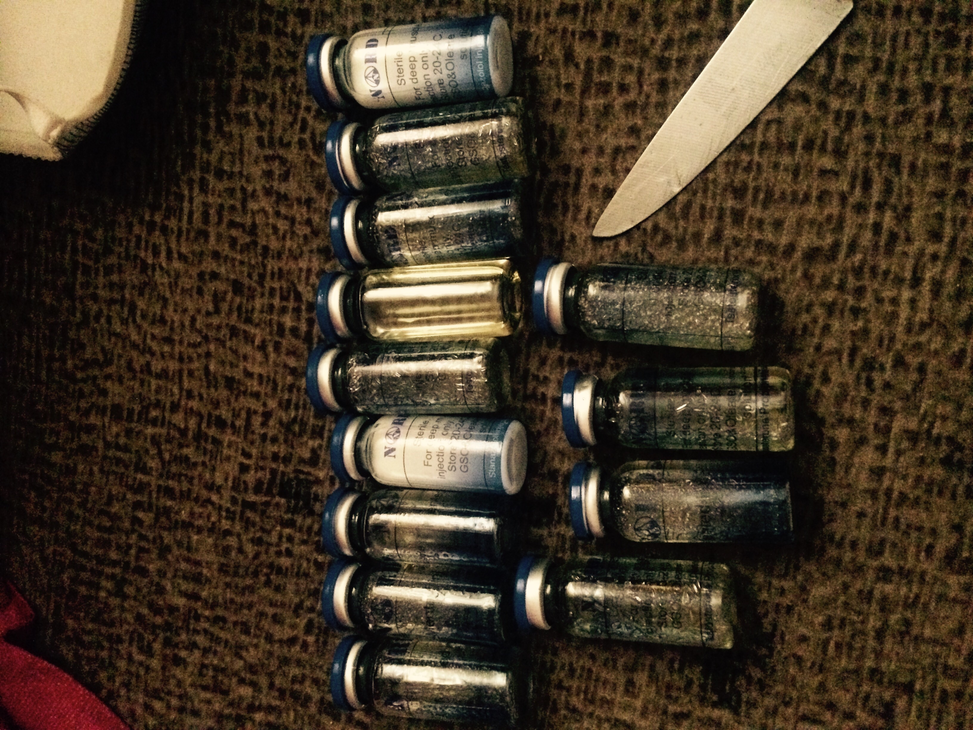 Приветствую Всех обитателей данной ветки. Вот наконец и пришел вчера ко мне полностью весь мой заказ. В мое распоряжение попал Болденон и Тест Е от NORD. Вчера поставил первый инжект: масло чистое(рассматривал каждую виалу по 5 мин, постороннего мусора нету), разлиты примерно одинаково(на фото видно). Набирается хорошо причем даже не разогревал, ставится отлично место укола первые 5 мин. тянет потом проходит и практически не ощущается. По таблеткам заказывал метан от «Вермодже», пришел от «Раджа» но не чуть не разочаровался и весьма доволен действием, пью с понедельника по 3 таб/день, во вторник вечером на тренировки уже во всю ощущал действие метана от раджи(действие коротких эфиров и т.д Я ощущаю на себе сразу), рекомендую тем кто еще думает. Единственный момент который опечалил это упаковка: метан был упакован в пупырчатую упаковку, а вот виалы просто обёрнуты в несколько слоев пищевой пленки и в результате одна виала разбилась. По идеи нужно упаковывать на оборот т.к метану транспортировка не грозит там нечего разбивать, а вот виалы по лучше обертывать. Но с дилером решил этот вопрос обещал доотправить, так что буду ждать развитие ситуаци.