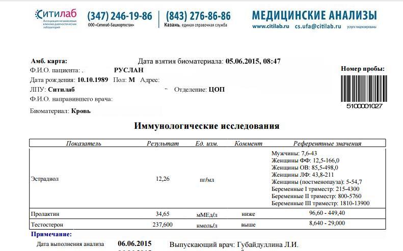 Результаты анализа через 12 часов после 4 инжекта тестостерона ципионата, дозировка 400 в неделю. На курсе присутствуют так же нfенил от FS в дозировке 200 в неделю. Анастрозол и берголак для Проfилактики (чуть переборщил)