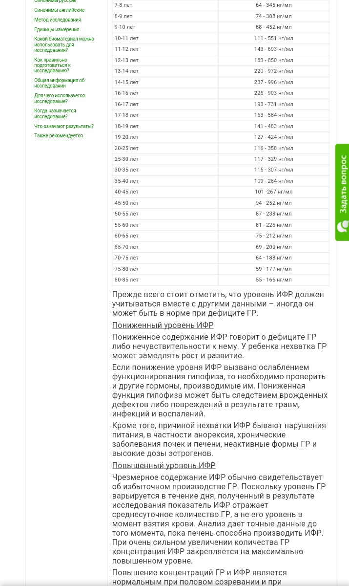 Содержание IGFBP-3 увеличено у детей и у подростков пубертатного возраста (наибольшее содержание у 14-16-летних), по достижении совершеннолетия начинает понемногу снижаться. Кроме возраста, влияют также на его содержание половое развитие, питание, а также функция печени и почек."