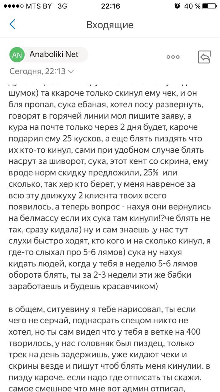 Всем привет. Скрин из переписки с моим админом. Я за ним 24 на 7 не слежу, написал - значит написал. Я не знаю что за тема с кошельками, но то что Арнольд это один человек (своего склада нет, обычный перекуп), которого я видел пару раз, и Юра с Белфармы - другой, с которым я знаком лично и с которым мы не так давно делали общие закупки, я отвечаю. Был у них сговор или нет, я не знаю, кидали они кого или нет, я не знаю, мне лично написало от силы человек 10, что их кинула белфарма или арни, на мой взгляд - это очень мало как для ситуации, когда магазин кидает людей почти месяц. Мне за этот месяц куда больше людей написало, что я -кидала. Более того, из всех кто мне отписался, у меня купило 2-3 человека, при том что я даже под шумок решил сделать акцию, 15% тому, кого кинула белмасса. Купон может человек 10 применило, из которых половина - мои постоянные клиенты. Пруфов мне никто не предоставлял, мне в то время хватало и своего гемороя, поэтому разбираться в ситуации мне было некогда и незачем - на одном рейтинге (399 +1 который) был знатный срач и типа куча жалоб, но по факту магазин как кинули в чс. так и достали его оттуда - тут уже не проканает история по заплатили, тк баннера у них там нет, и они сейчас не на первом развароте, хотя были в топ -4. Да хотели урвать немного клиентов, может где-то админа заебало то, что начали просто поголовно срать в коментах, мол кидалы, белмасса -2, тупо человеку не отвачали несколько часов, он везде где можно писал что его кинули. Трек на день задержали - кидалы. Кароче, я думаю как для кидка, очень мало реальных пруфов, историю можно про кого угодно хуевую сочинить, от этого она правдой не станет (привет нашим сми). Администрации Белфармы приношу извинения за необоснованную клевету в их адрес, пользователю, выложившему скрин - я все понимаю, даже если реально тебя кинули, тебя в этой же переписке просили не ссылаться на наш сайт и понятно, не кидать скрины. У нас город/страна маленький, все владельцы магазинов друг друга знаю, галимая подстава. Админ за свою нездерженность уже получил. ПС. По поводу одного курьера, ну есть у нас курьер, забирает посы, отвозит -отправляет, скидывает чеки, это не мое деле, берет он посы еще у кого или нет. Как и то, чем занимается Белмасса.