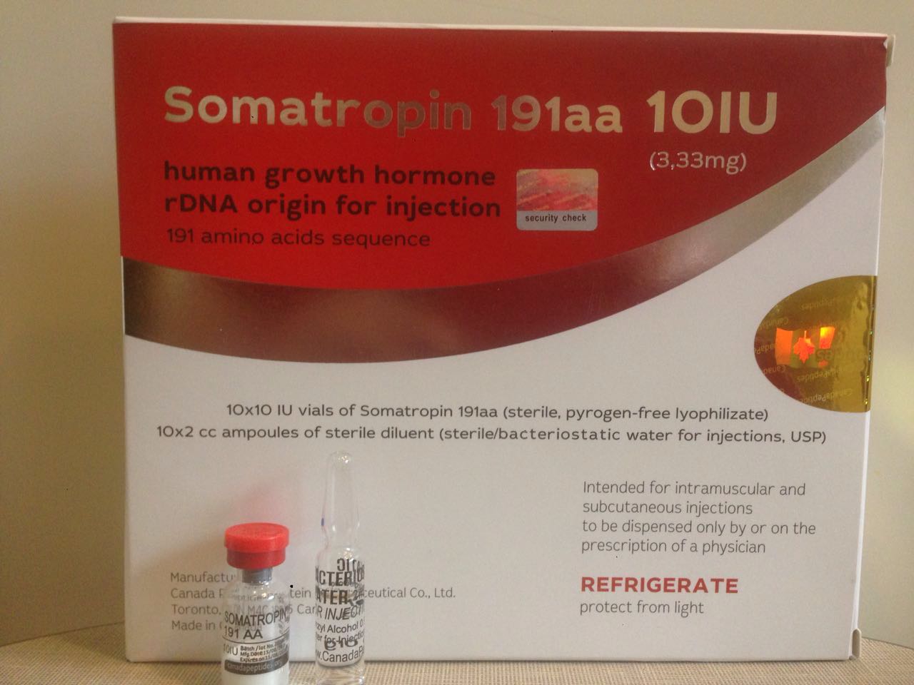 Оригинальность попавшего к вам в руки продукта проверяется введением кода с голографической наклейки на коробке на сайте производителя Canadapeptides.org ! Кроме того, вы сами можете проверить качество непосредственно содержащегося во флаконе препарата Somatropin 191aa путем сдачи соответствующего анализа в любой лаборатории, а также сравнить показатели с результатами гормона роста который вы уже использовали.