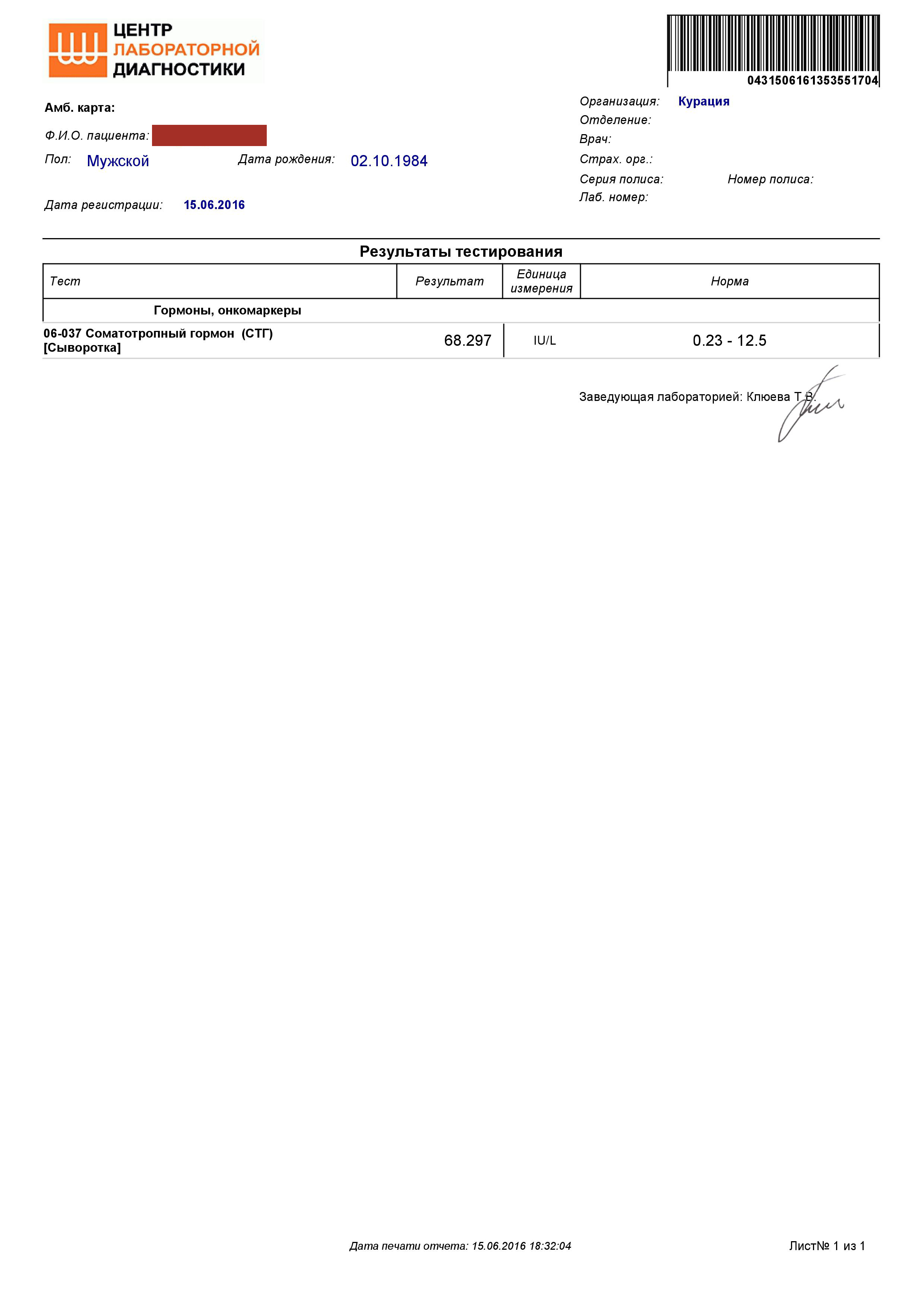 * Анализ гормона роста проводился специалистами "Центра химических исследований" (г. Москва)