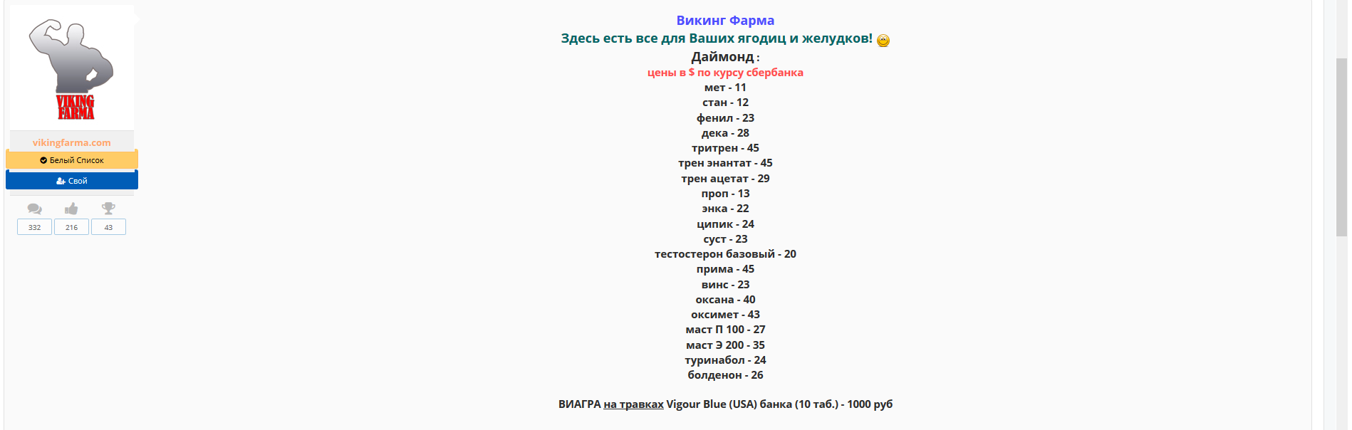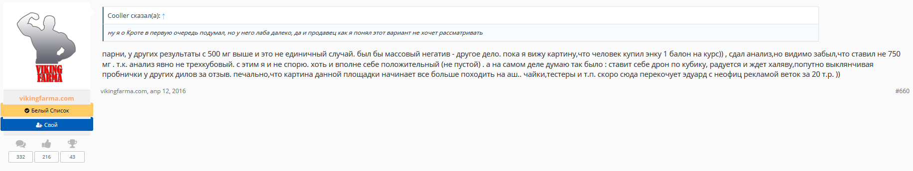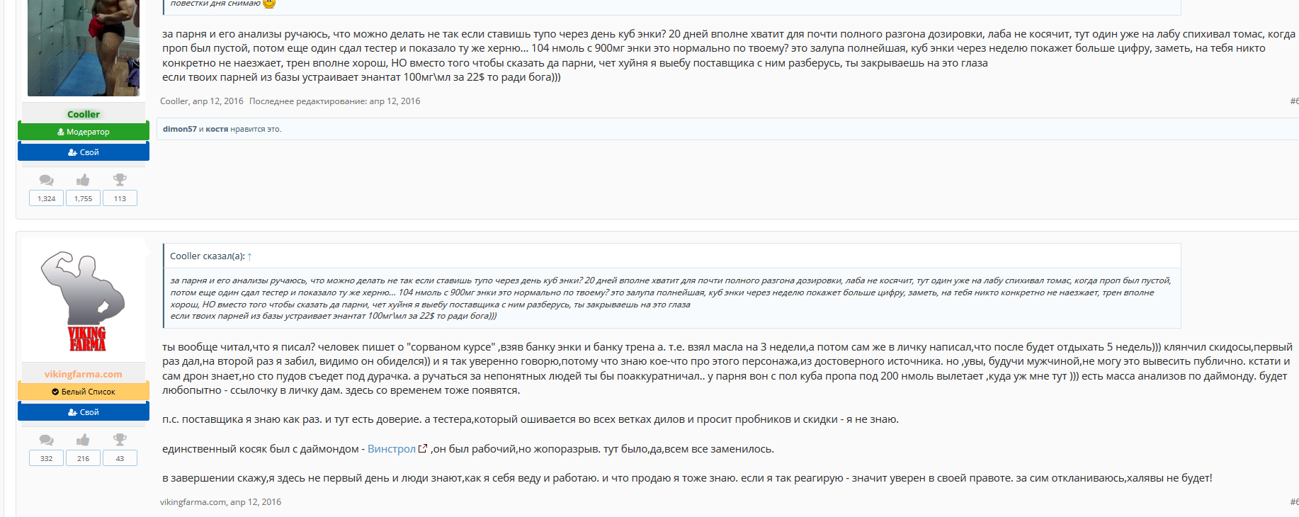 Вывод - возможно, перед нами сам Викинг:grr: которые создал сайт рестека и сидел его дома шлепал заливая олейну в тест энантат, а тест энантат в болд. А, да, длинный мастерон - тестостерон фенилпропионат ))