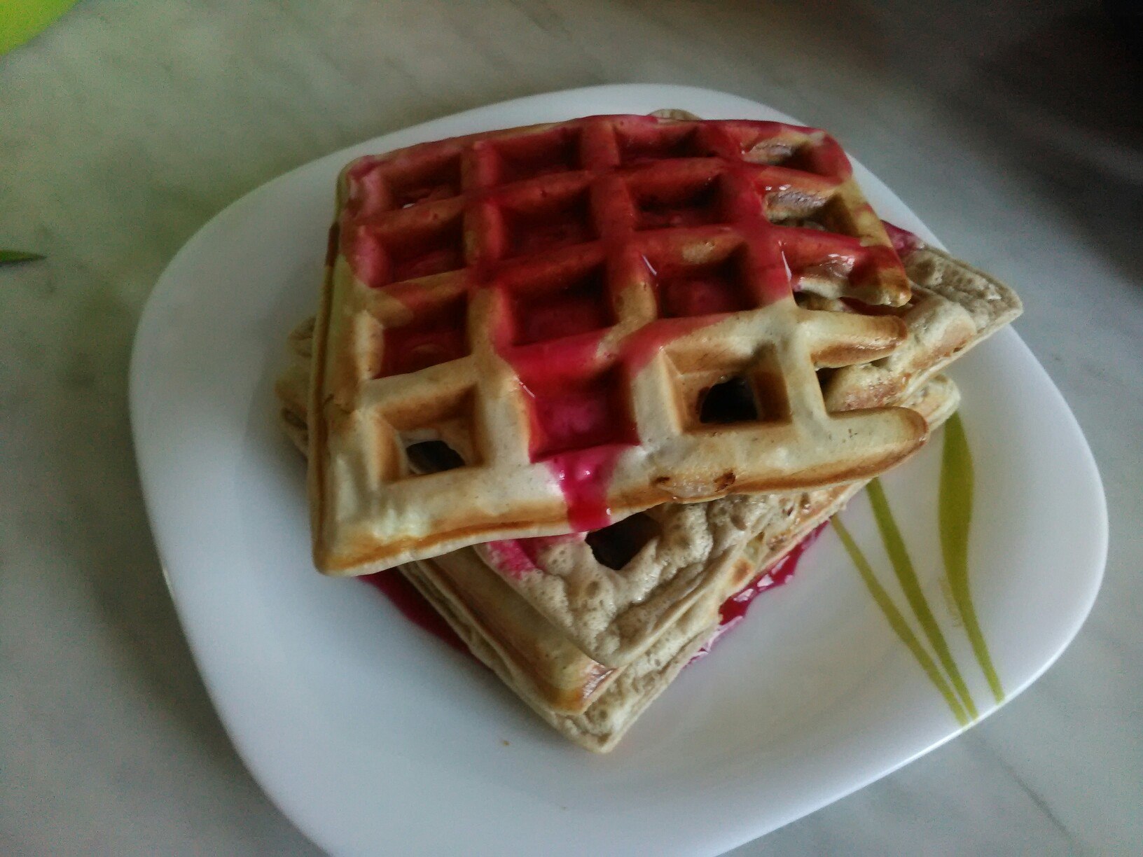 3 скупа прота, 3 яйца, молока 50 мл, овсянка 50гр, 50 гр банана, перемешал, и в вафельницу )
