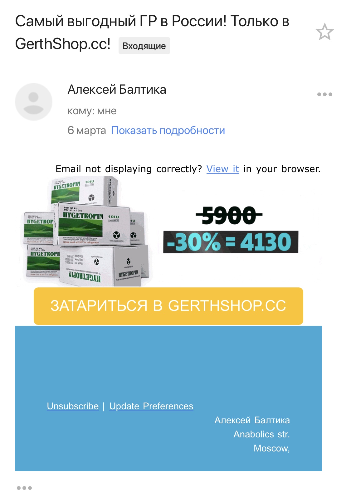 Мне на почту пришла, как обычно, рассылка от gerthshop.cc об акции на Хайгетропин по цене: 5900-30%=4130 руб. (см. фото письма)