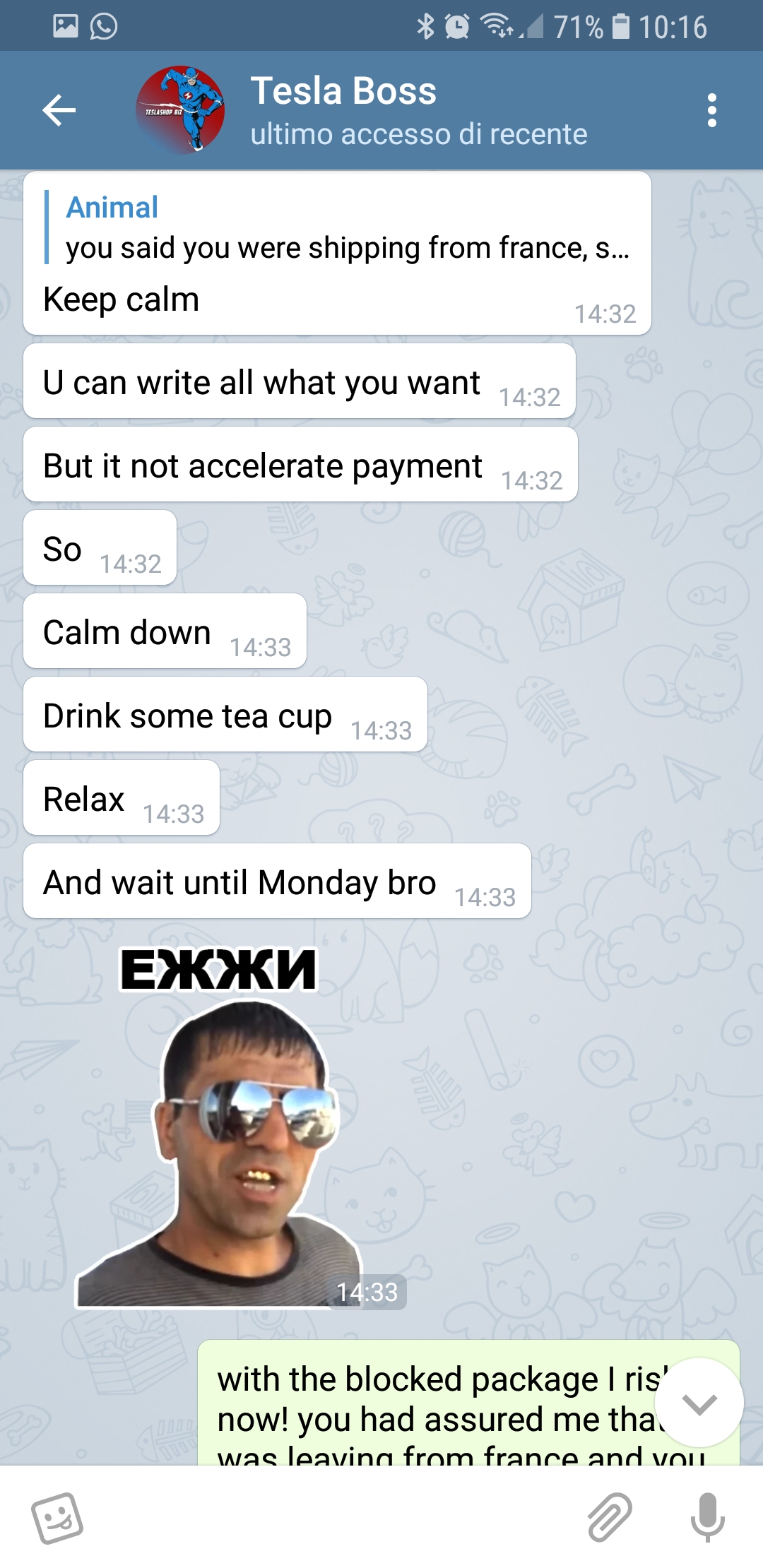 are you still making fun of me? I have the screenshots, on telegrams that we had agreed upon for shipping from France and you cheated me! today you had to compensate me and you changed by inventing that it is not blocked!