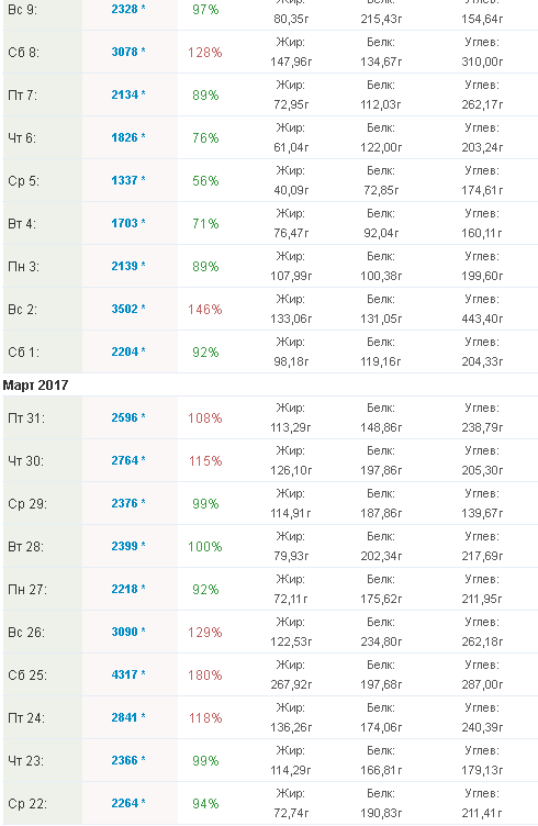 Мне не нравится твоё питание если честно. В последние дни стало намного лучше. Но твои недоедания это ненормально. У тебя должен быть чёткий режим с+- 10 гр. жиров постоянно перебираешь. Белка недоедаешь. Ищи для себя нутриенты белковые и любимые. Основные зажоры это выходные. Как я знаю часто твои выходные протекются с сынишкой, так вот почему отец даёт неверный пример питания?? Наберёт твой сын лишний вес подростком, будет испытыват много комплексов, будут проблемы с женщинами, учитывая ещё твой развод. Мне кажется тебе бы не хотелось такой участи сыну, ты сам этотвсе прошел. Скоро менять сплит надо. Как часто можешь тренироваться?? Три раза в неделю?