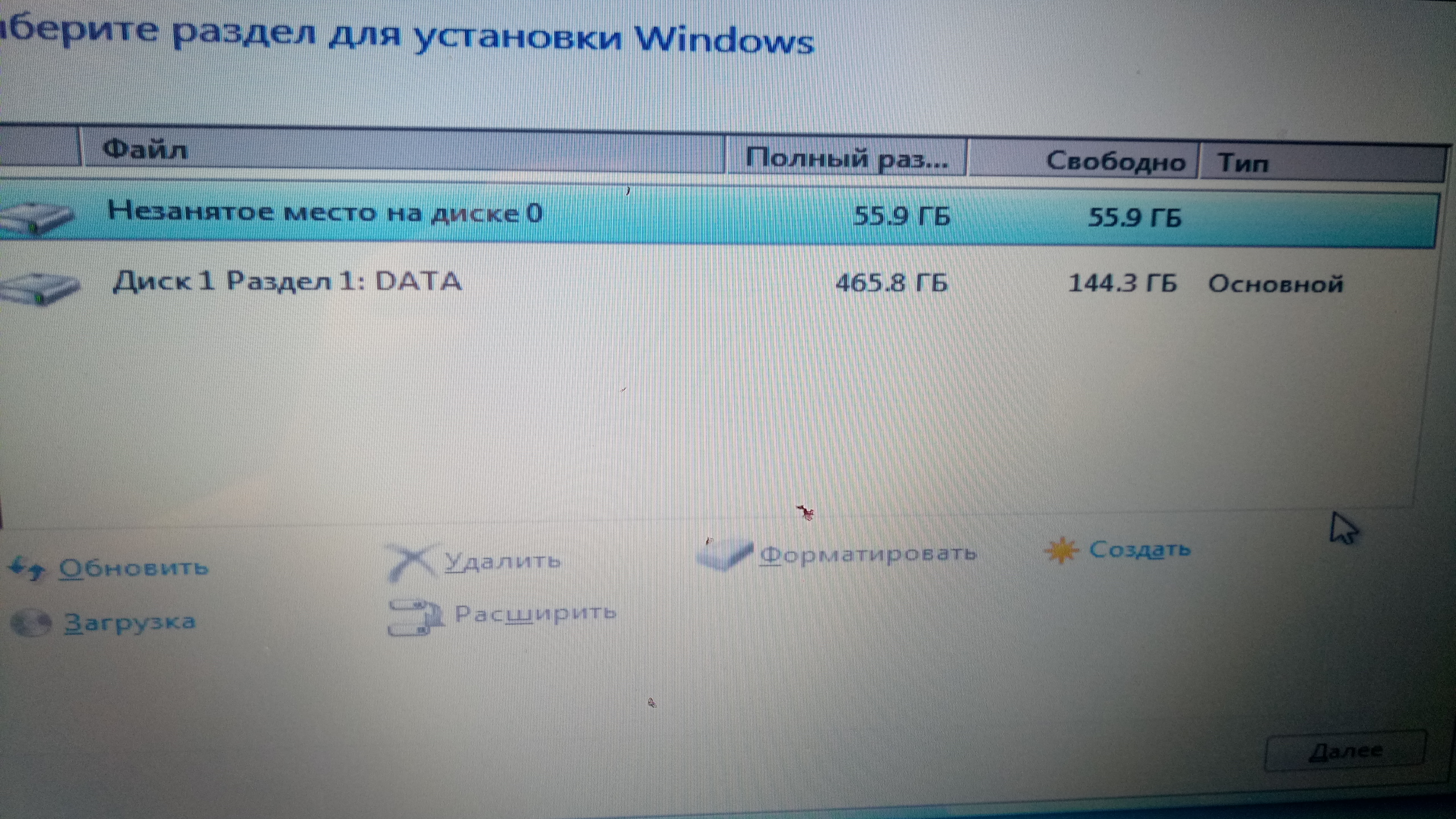 См. Фото. Ничего кроме далее и создать не доступно. Если нажать, например далее, то должна начаться установка винды, но комп просто затупливает и ничего не происходит. Это окно так и не меняется.