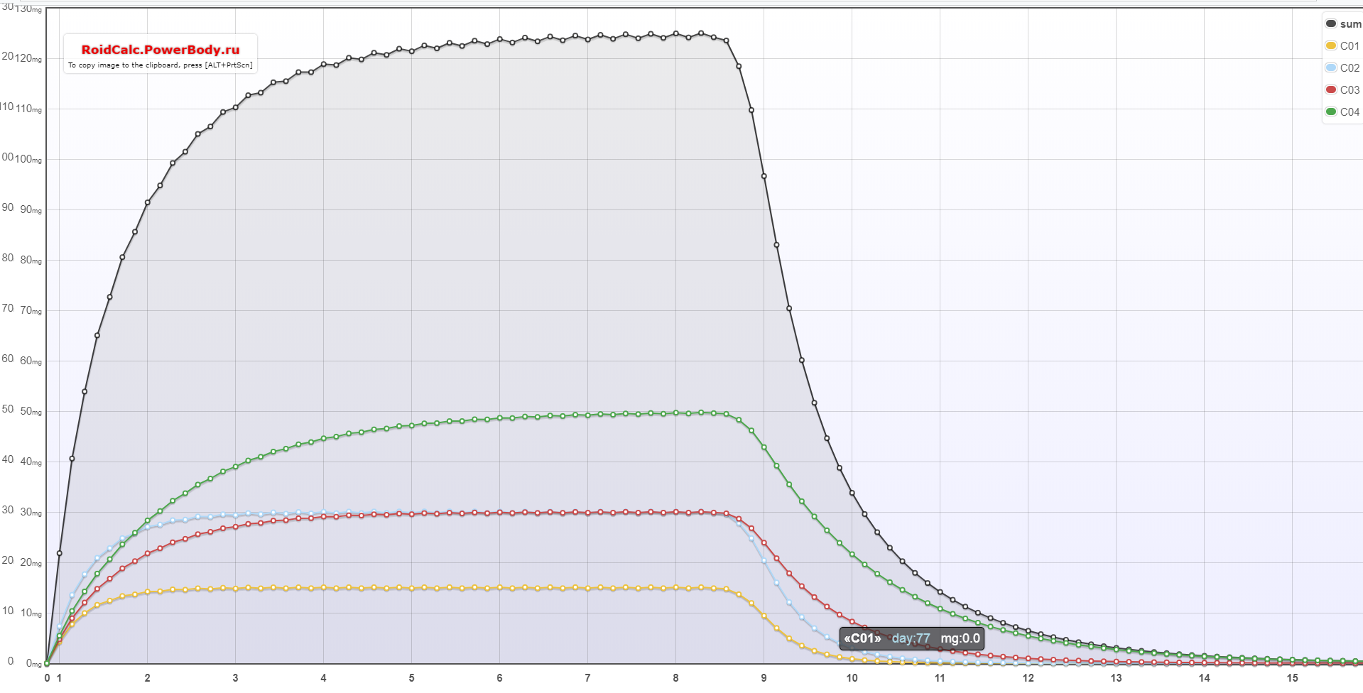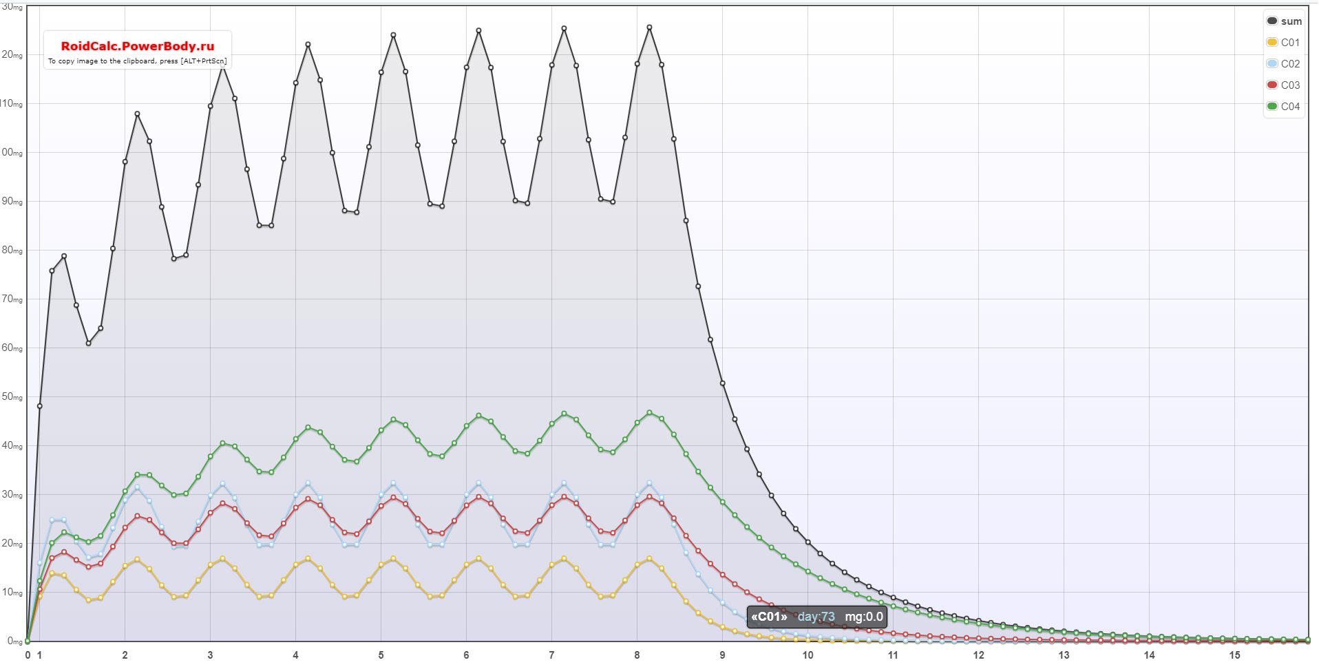 Смотрите на суммарную концентрацию, обозначена черным. Остальные цвета - эфиры. Забивал 90 пропа, 180 фенила, 180 изо, 300 деки. Там чет меняли в эфирах, я не помню, насрать.