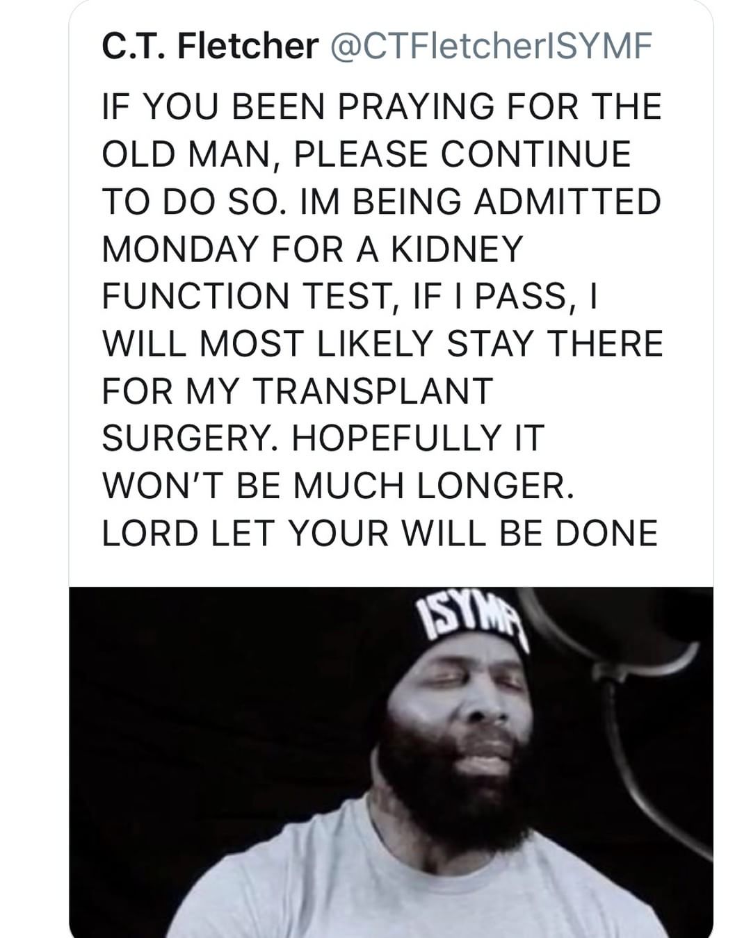 Известный спортивный блогер, мотивирующий миллионы подписчиков по всему миру на разрушительные тренировки, после пережитой им в прошлом году остановки сердца находится в очереди на трансплантацию этого жизненно важного органа. В настоящее время он вновь направлен в госпиталь для обследования почек и сдачи анализов. Однако это скорее хорошая новость, чем плохая, ведь при благоприятных результатах анализов С Т Флетчер сможет с полной определенностью рассчитывать на операцию, которая, вполне возможно, поможет вернуть ему здоровье.