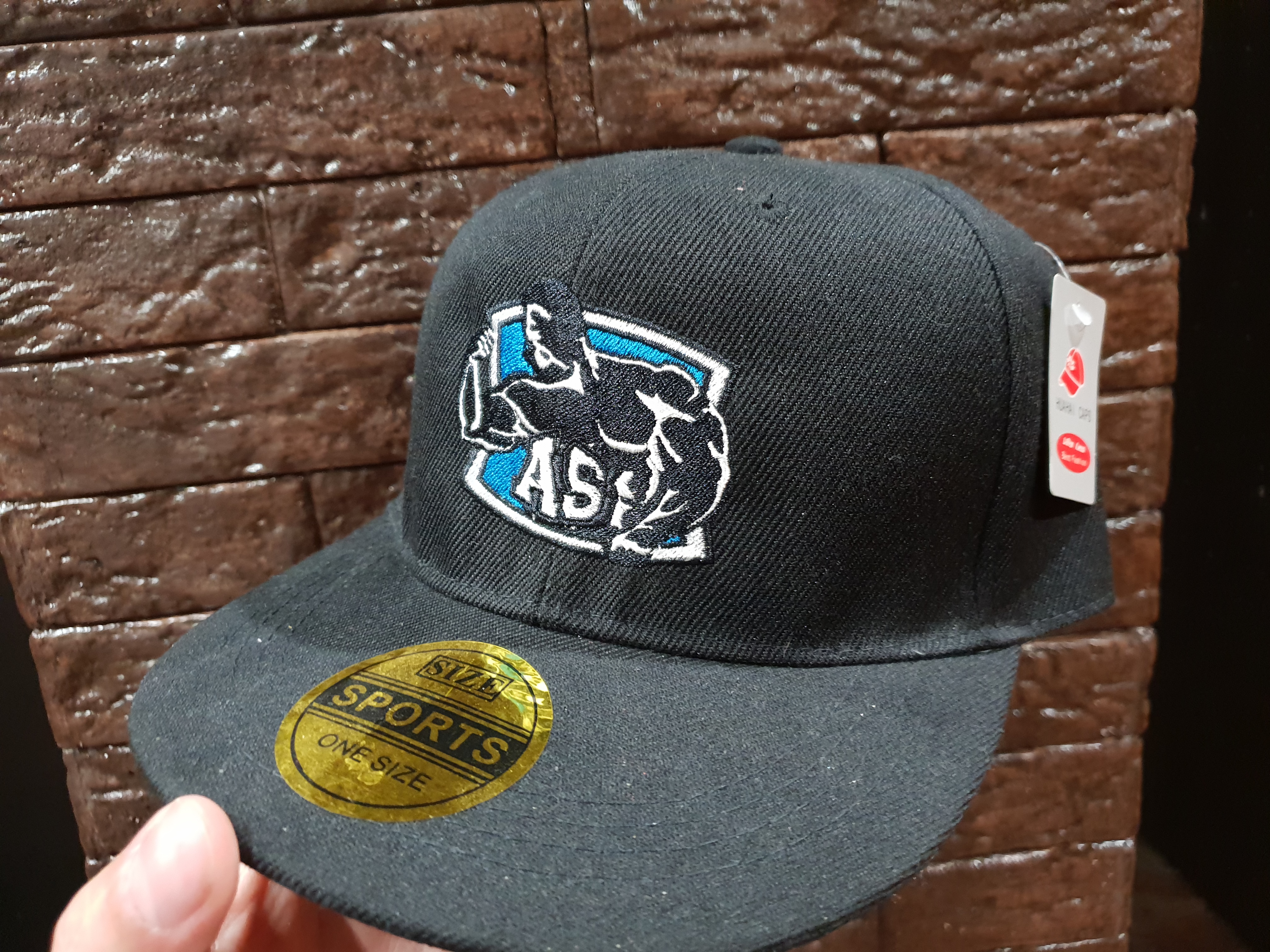 У меня нету( это когда бейсболки заказывали для клана, сделали первую пробную и забыли надпись добавить. Вот и вышла чисто АШ бейсболка. :)