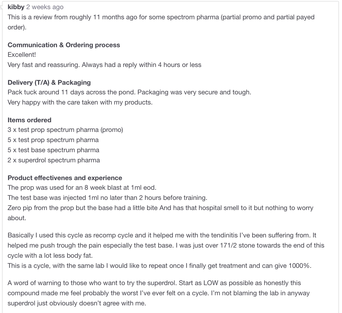 Пару слов предостережений, кто хотел бы попробовать супердрол. Начинайте с самых маленьких дозировок, насколько это возможно, так как этот препарат, честно говоря, заставил меня почувствовать самое худшее, что я когда-либо чувствовал. Я ни в коем случае не обвиняю производителя насчет супердрола, но очевидно, что он со мной не сдружился.