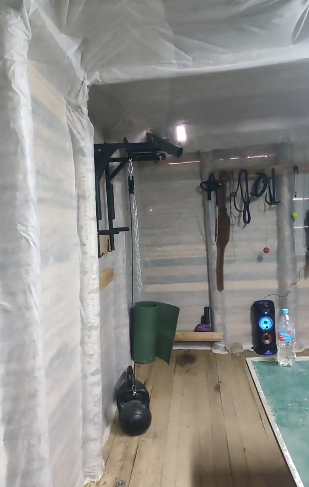 Потренил, спину и плечи, у меня вот такой зал в блиндаже, в принципе нормально было бы желание тренироваться