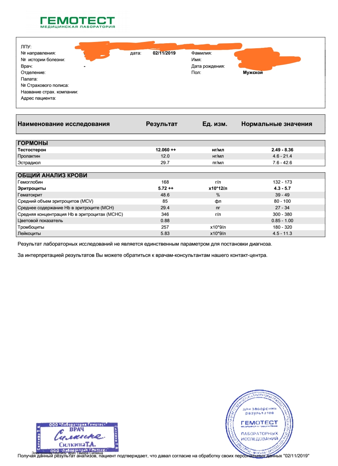 01.11 - был четвертый укол и по времени 21-й день на тестировании данного препарата. Соответственно, согласно мануалу тестера, решил сдать контрольные анализы. 02.11, через 24 часа после инъекции, сдал в Гемотесте анализы Тестостерон и для себя Эстрадиол, Пролактин и ОАК.
