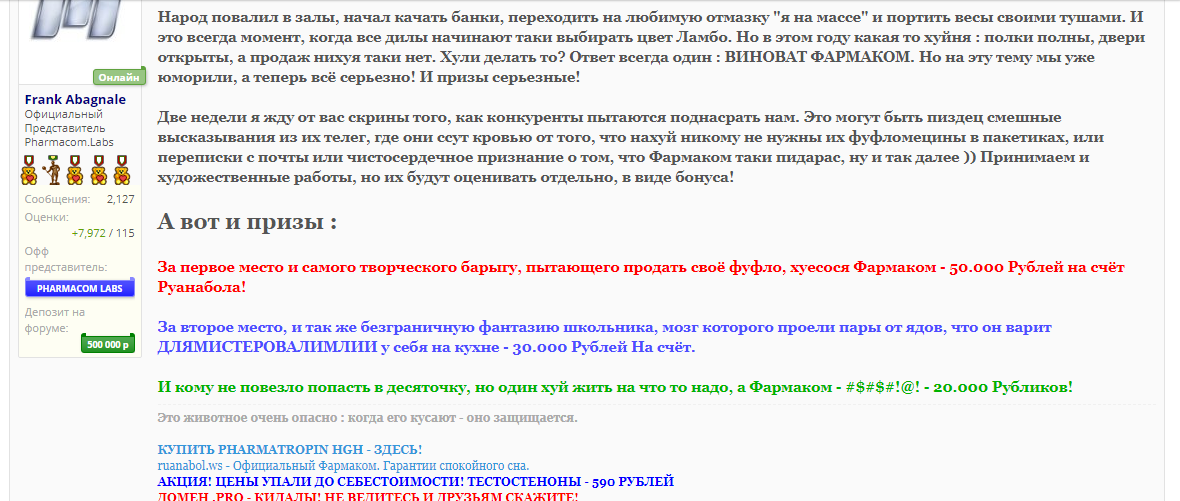 1. Завершился конкурс на самого творческого барыгу, который старается очернить качество продукции Фармакома. Призы будут выданы согласно занятых мест, подробности в теме: https://chat.ashops.net/threads/7996/page-24 Новостной дайджест за 31.10.2019 - Бодибилдинг форум AnabolicShops