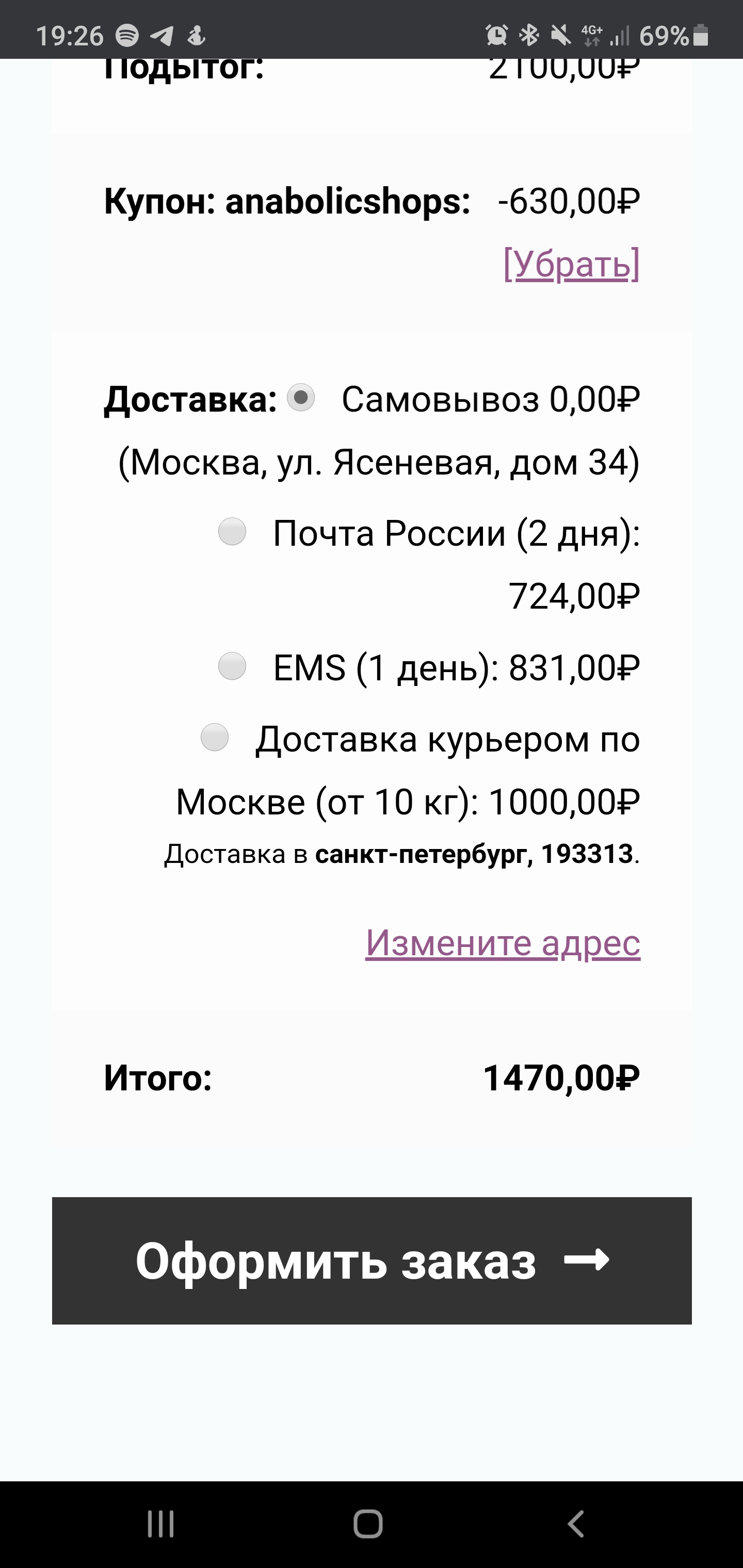 Если вы напишете в личку или на электронную почту sales@instant-oats.ru свой адрес и свой заказ, мы можем вам сказать сколько выйдет доставка. И подскажем как ее оформить.
