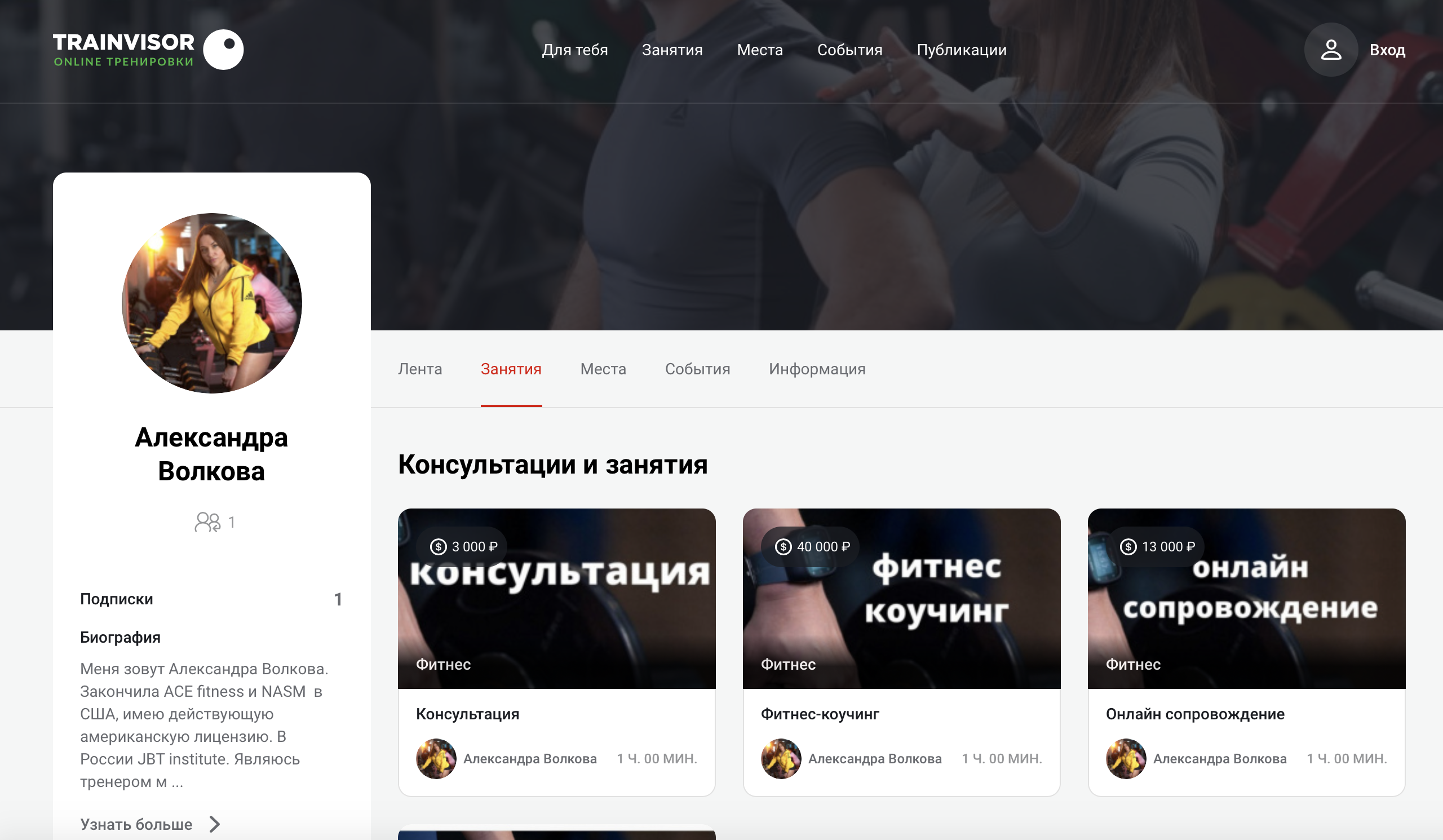 Как мы уже рассказывали, на главной странице сайта представлены тренеры нашего проекта. Вы можете изучить каждого: посмотреть их информацию "о себе", почитать статьи, попробовать программы тренировок или питания, что выкладывают тренеры в общий доступ.