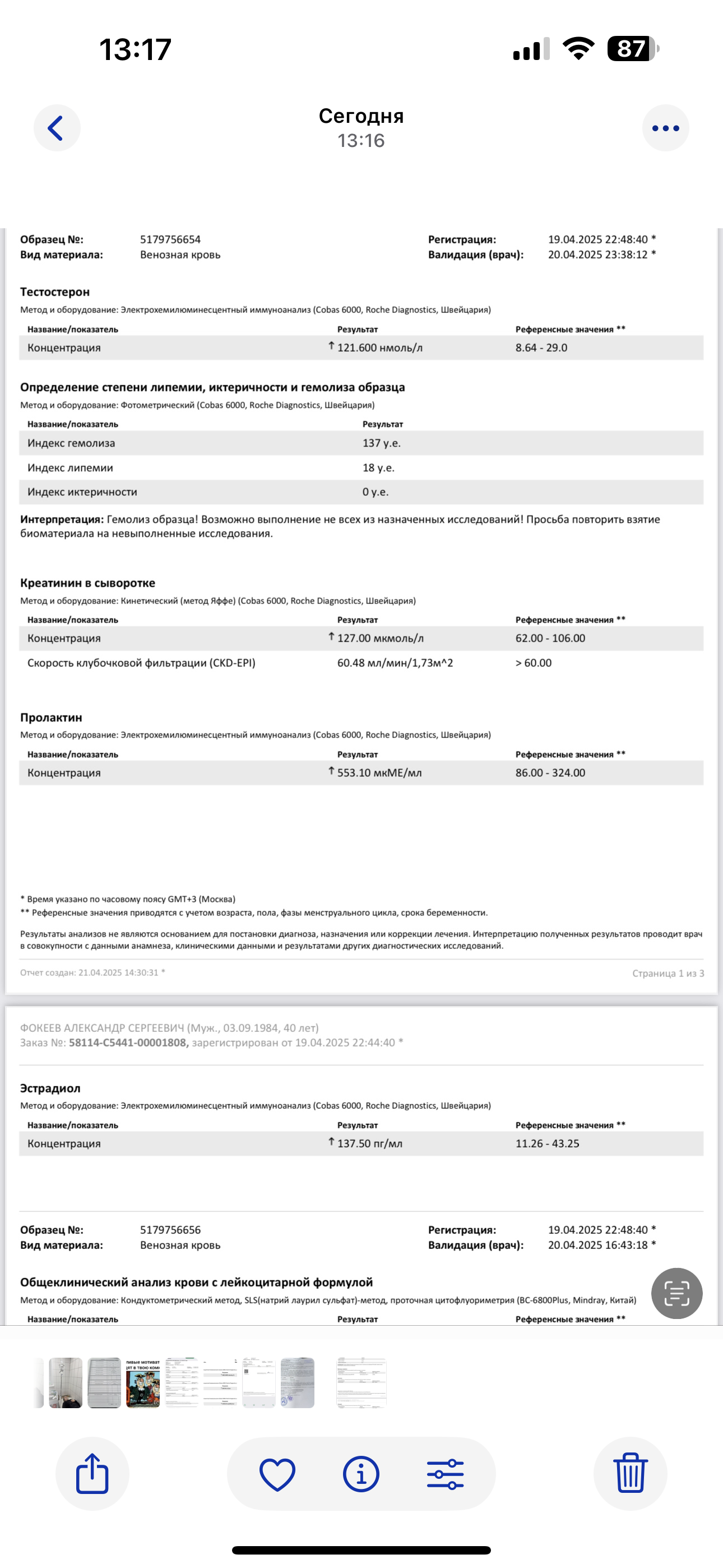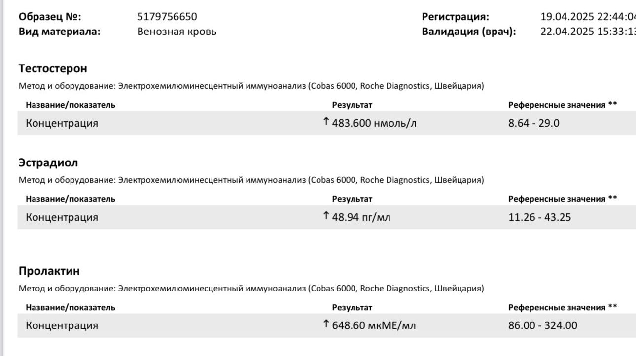 5) Анализ на пролактин сдан через 40 часов после последней инъекции. Подготовка к анализу была строго по всем правилам. Имеется небольшое повышение пролактина.
