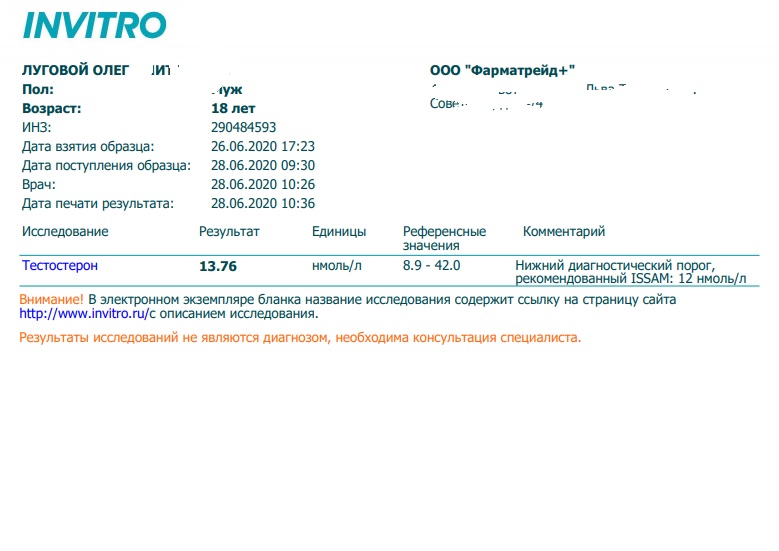 Ну хотя бы позвони и скажи, что сомневаешься в правильности анализа, так как, например 2 недели назад тестостерон был в 6 раз выше, и с чего бы ему падать сейчас?