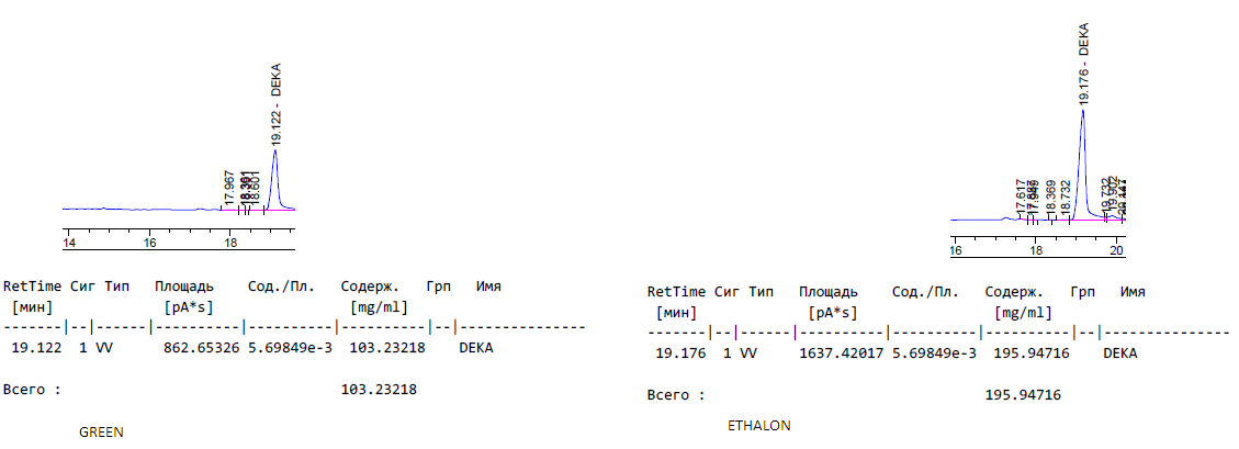 Нашел у себя в закромах Деку от Green, решил заколоть. На графике для сравнения указан хромо эталона (200 мг) и хромо Green.