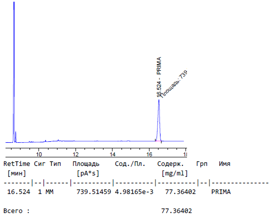 Сейчас мы поставили методики на большинство ДВ по методу газовой хроматографии с пламенно-ионизационным детектором. У каждого вещества есть свое время и свой пик. В общем, все будет видно далее.