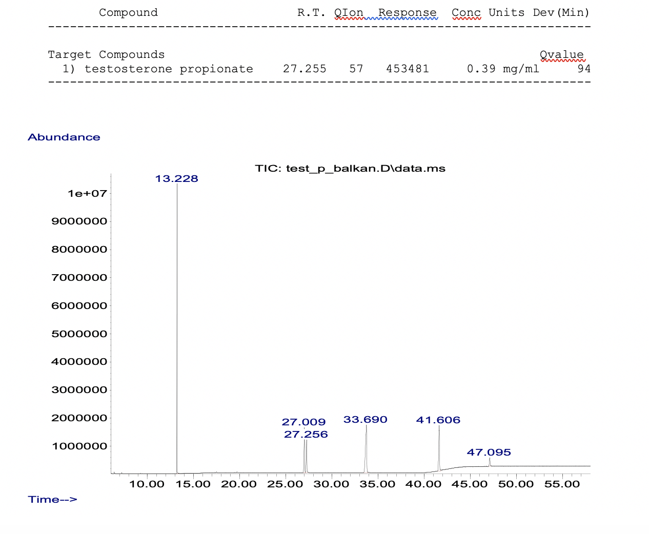 1. Хроматография: образец содержит Тестостерон Пропионат.