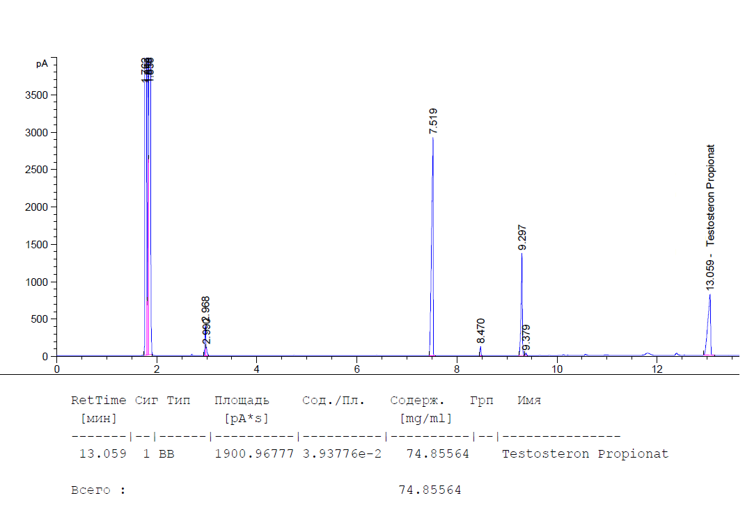 1. Хроматографическое исследование образца на качественное содержание - образец содержит Тестостерон Пропионат.