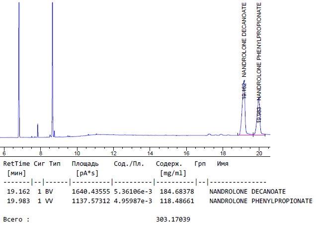 1. Качественный анализ: образец содержит действующие вещества - Нандролоны Деканоат и Фенилпропионат.